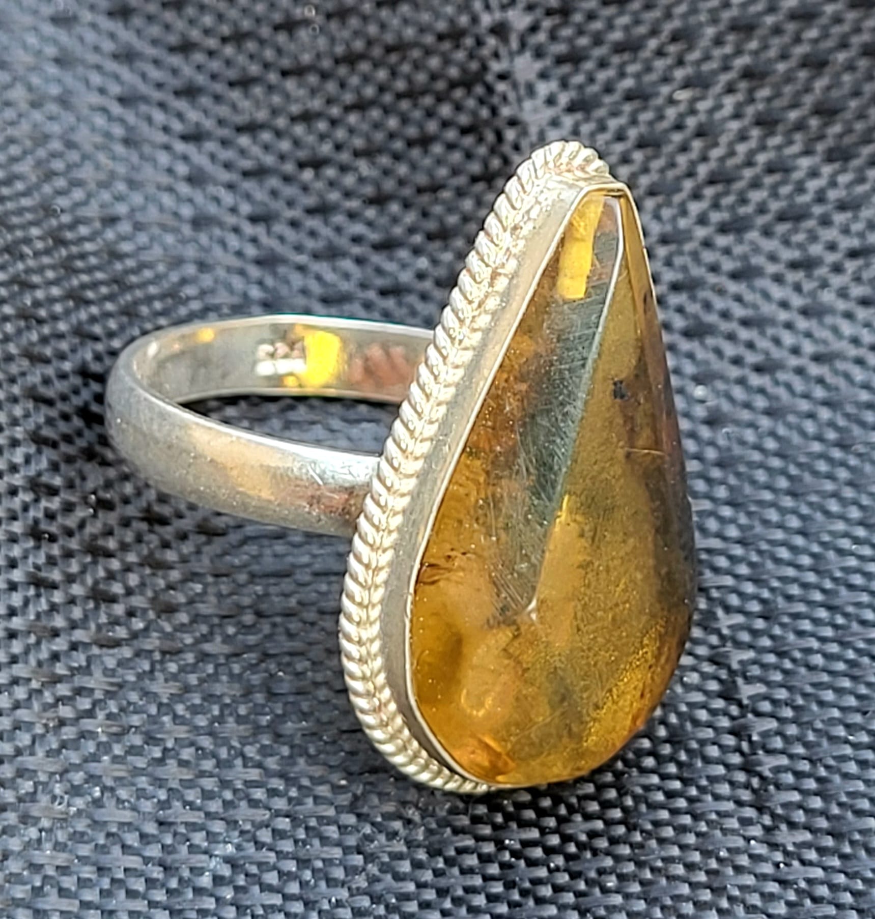 Cette bague ajustable statement en argent 925 présente un ambre naturel en forme de larme aux inclusions préhistoriques remarquables. Cette résine fossile dorée révèle des fragments végétaux et traces organiques millénaires parfaitement conservées.