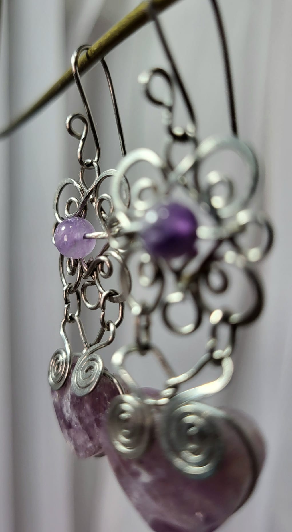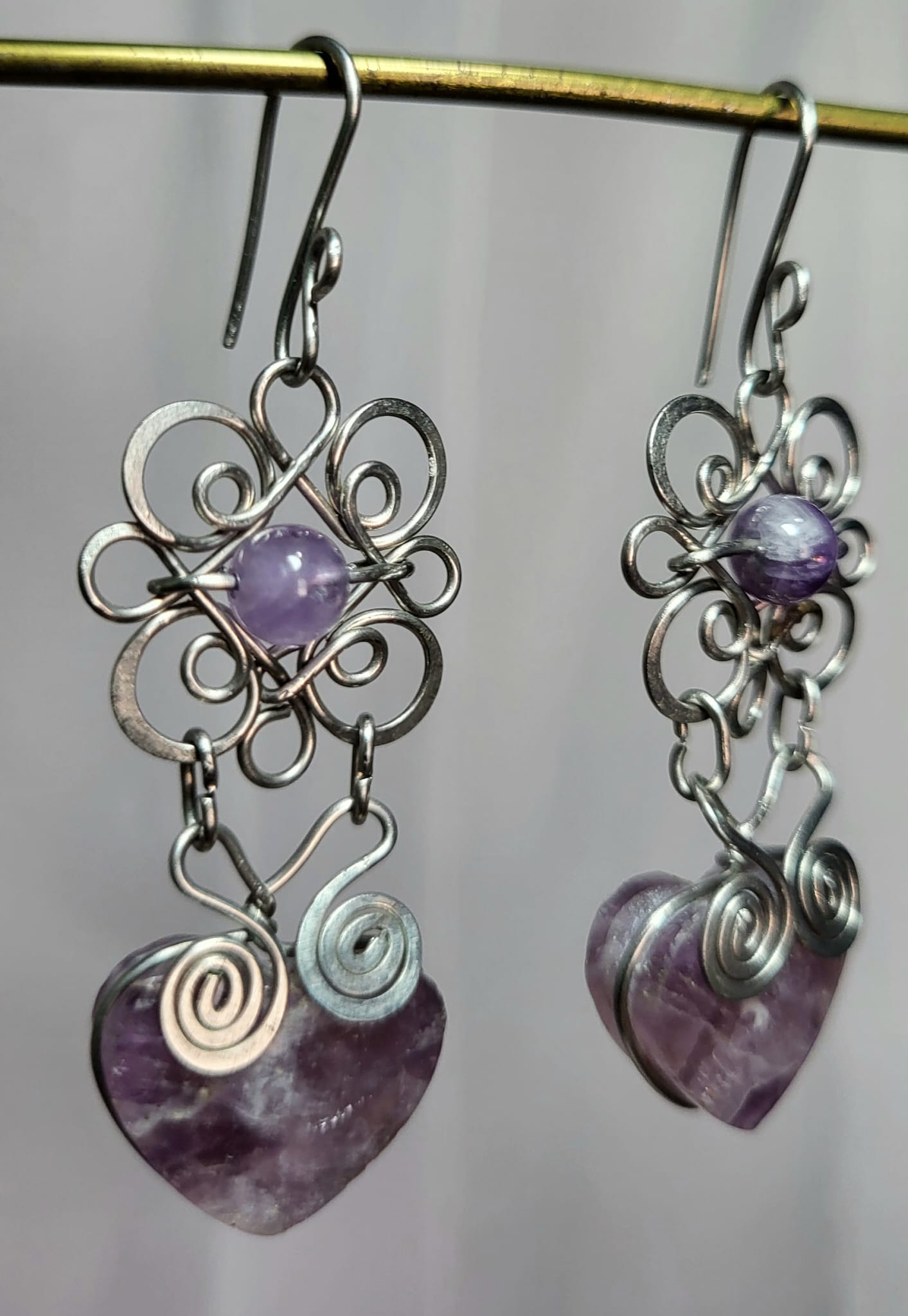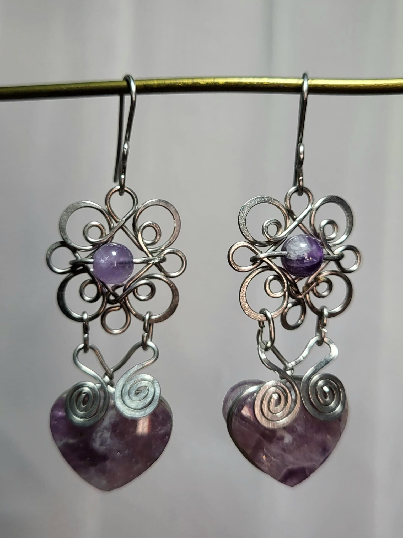 Boucles Acier Cœur Améthyste Filigrane Fait Main