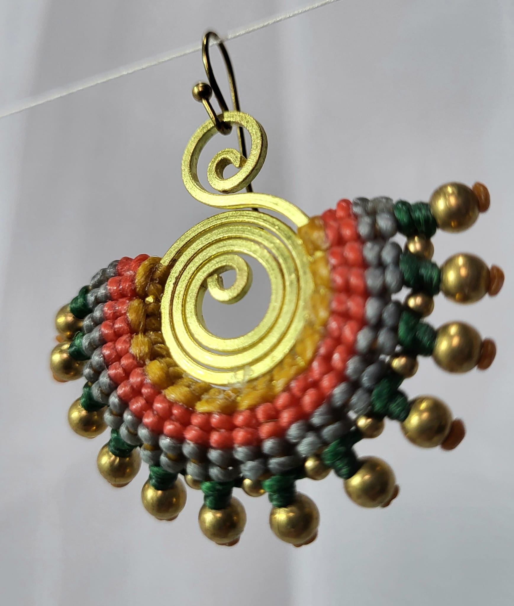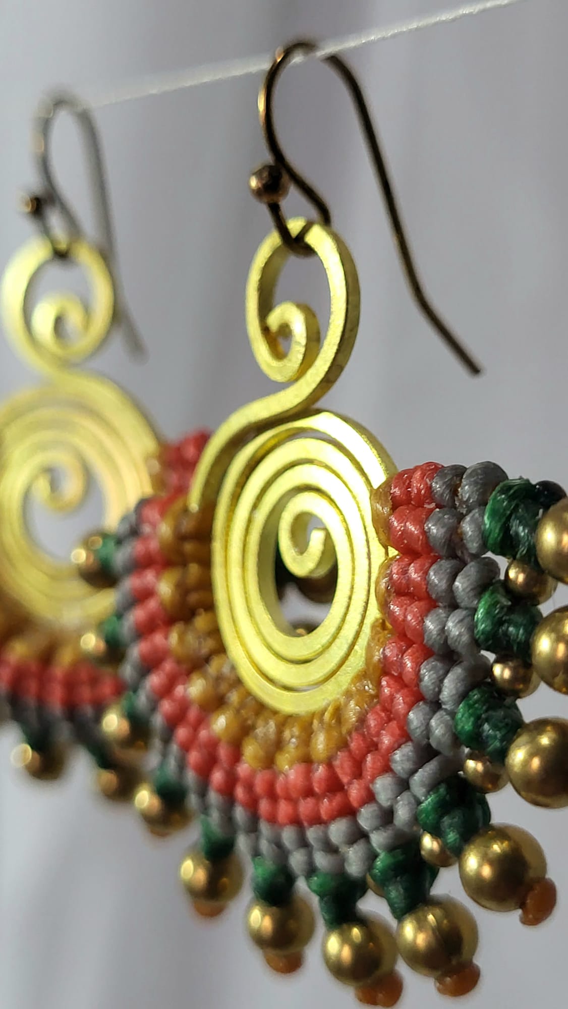 Boucles artisanales bronze et macramé fait main. Spirale soleil en bronze, éventail de macramé corail, jaune moutarde, gris et vert émeraude, frange de perles bronze. 5cm. Chaque nœud noué à la main. 100% artisanat mexicain. Pièce unique. Livraison offerte.