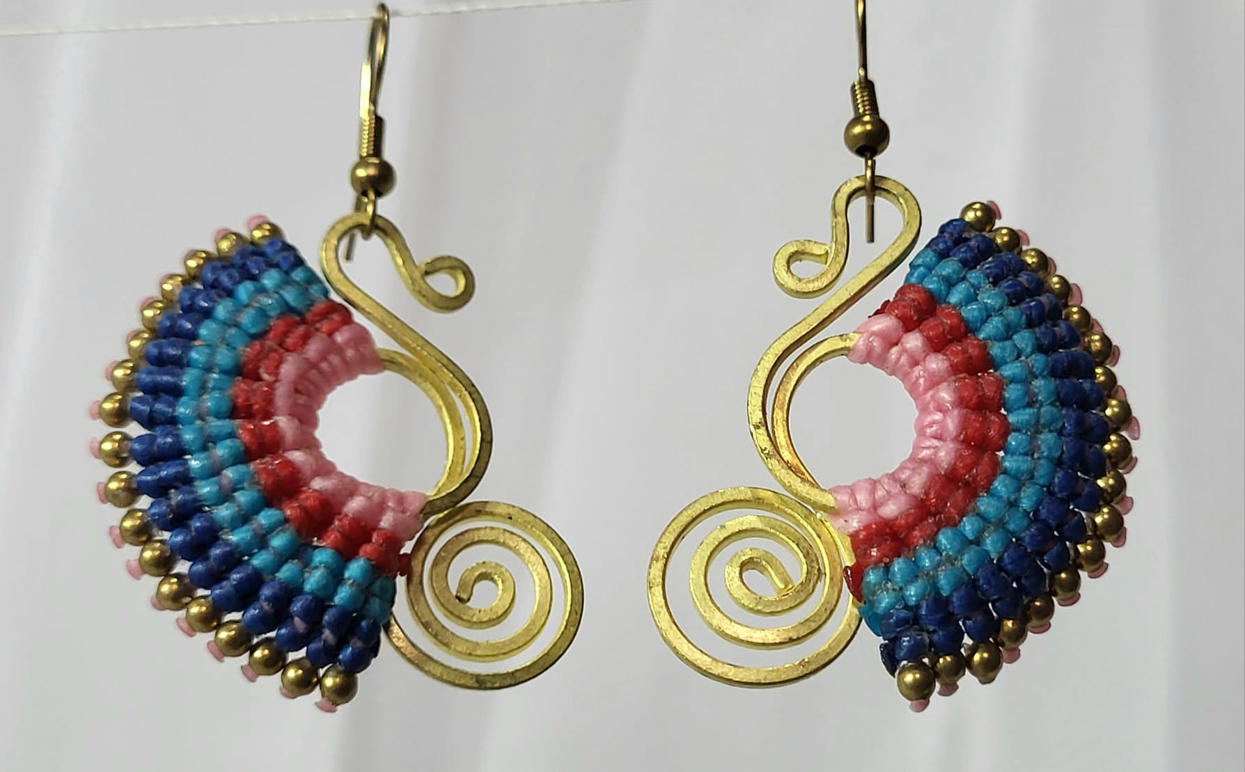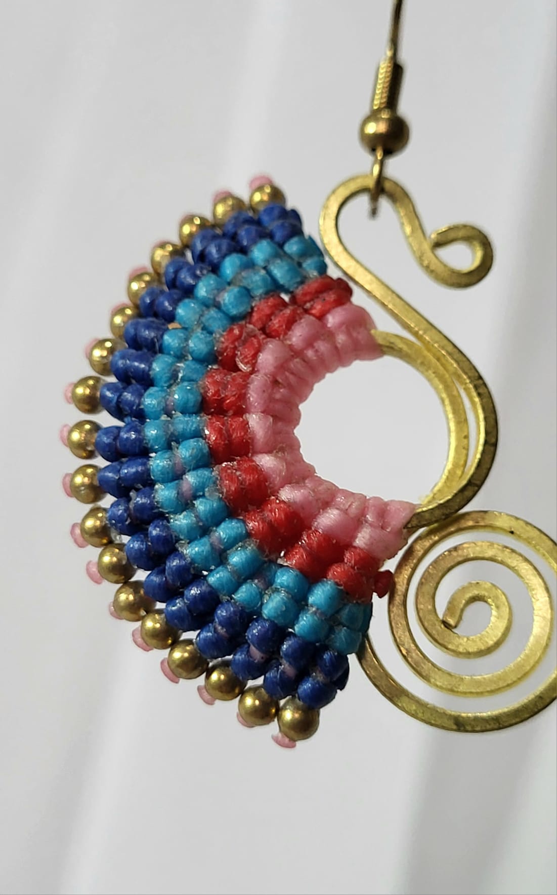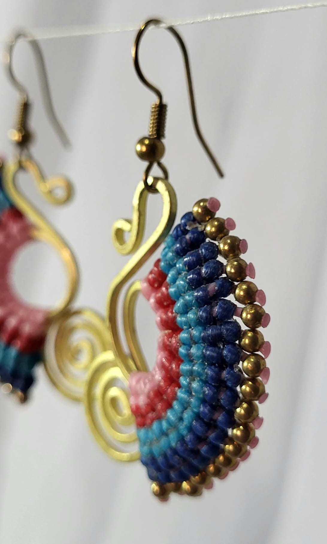 Boucles artisanales bronze et macramé fait main. Spirale S en bronze, demi-lune de macramé rose, turquoise et bleu marine, perles bronze. 4.8cm. Couleurs vives et joyeuses. Chaque nœud noué à la main. 100% artisanat mexicain. Pièce unique. Livraison offerte.