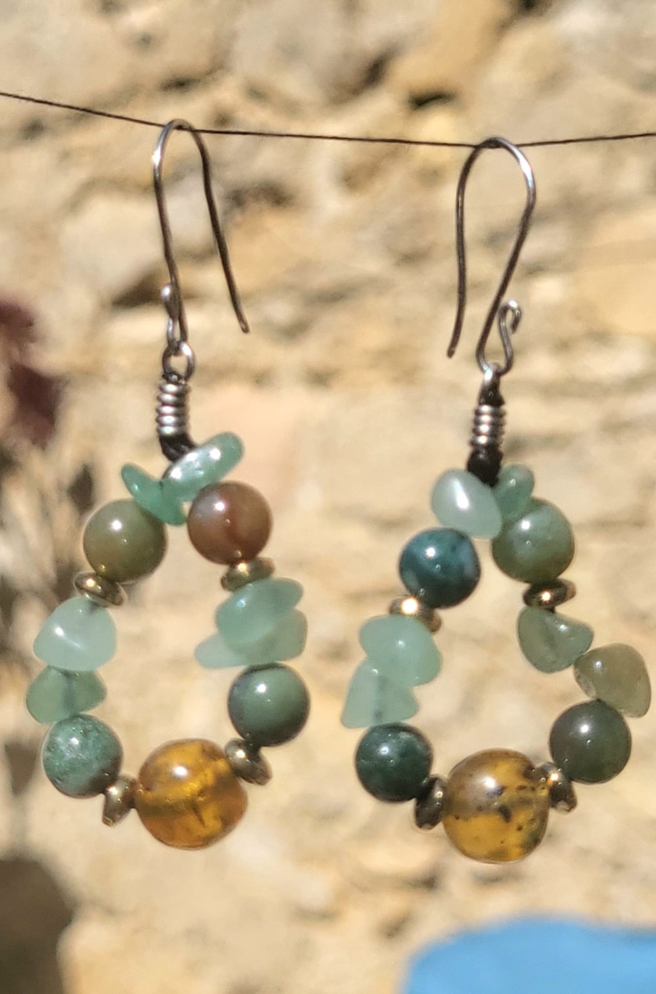 La nature révèle ses secrets dans ces créoles extraordinaires où chaque perle raconte l’histoire des forêts primordiales. L’ambre translucide capture les rayons du soleil matinal, tandis que l’aventurine déploie ses nuances de mousse et de feuillage nouveau. Les perles forestières aux teintes variées créent une symphonie chromatique qui évoque la richesse des sous-bois après la pluie. Assemblées en cercles sacrés selon des traditions millénaires.