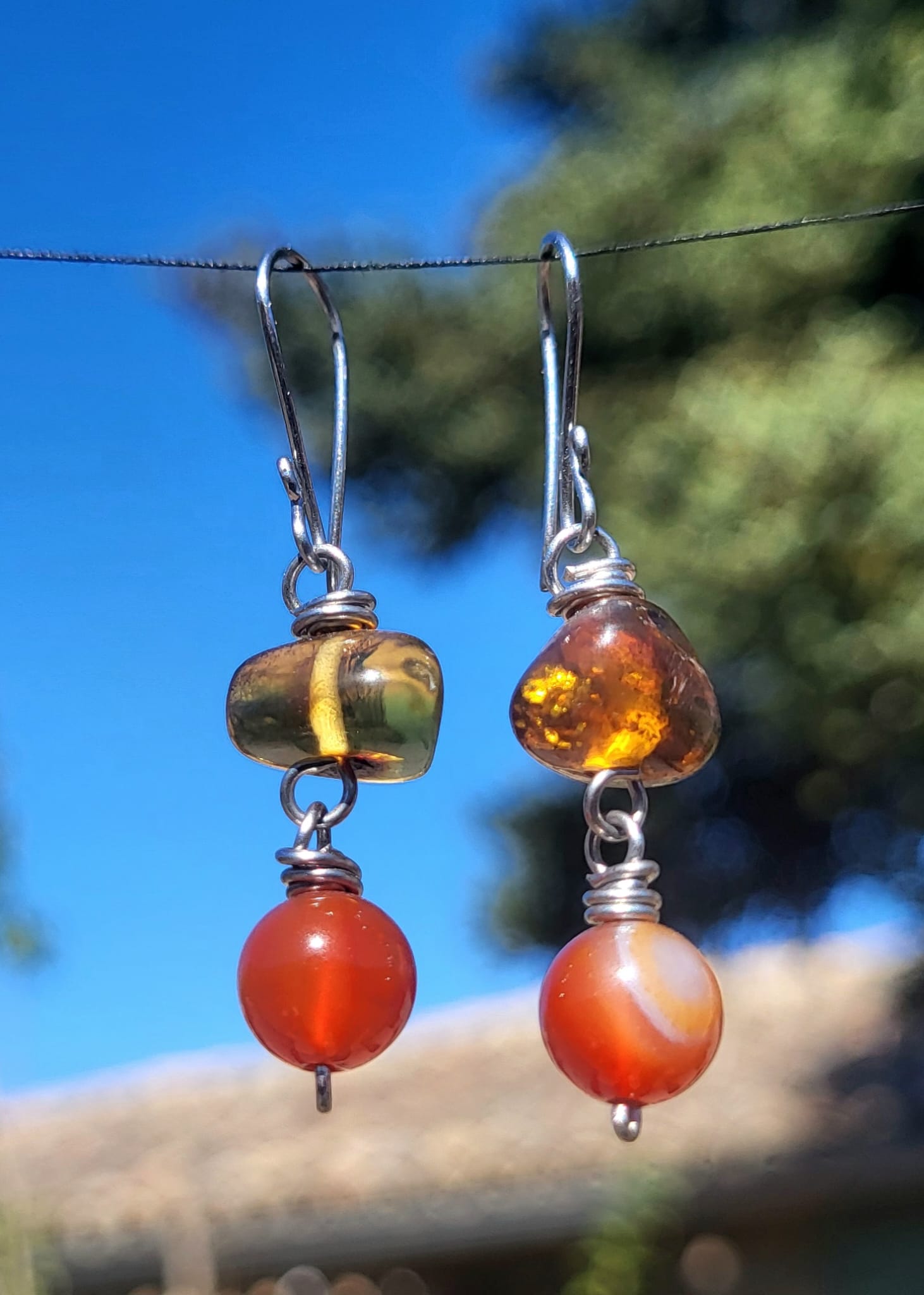 Découvrez ces boucles d’oreilles d’exception conjuguant la magie de l’ambre fossile et l’énergie ardente de la cornaline. Chaque pièce révèle des inclusions dorées emprisonnées dans l’ambre translucide, témoins d’un temps immémorial. La cornaline rouge flamme apporte sa vitalité complémentaire. Le montage spiralé en argent sterling 925 sublime ces trésors naturels par un savoir-faire orfèvre raffiné. Mesurant 5cm, elles offrent un équilibre parfait entre présence et élégance. En lithothérapie, cette alliance favorise créativité, courage et ancrage énergétique. Création unique.