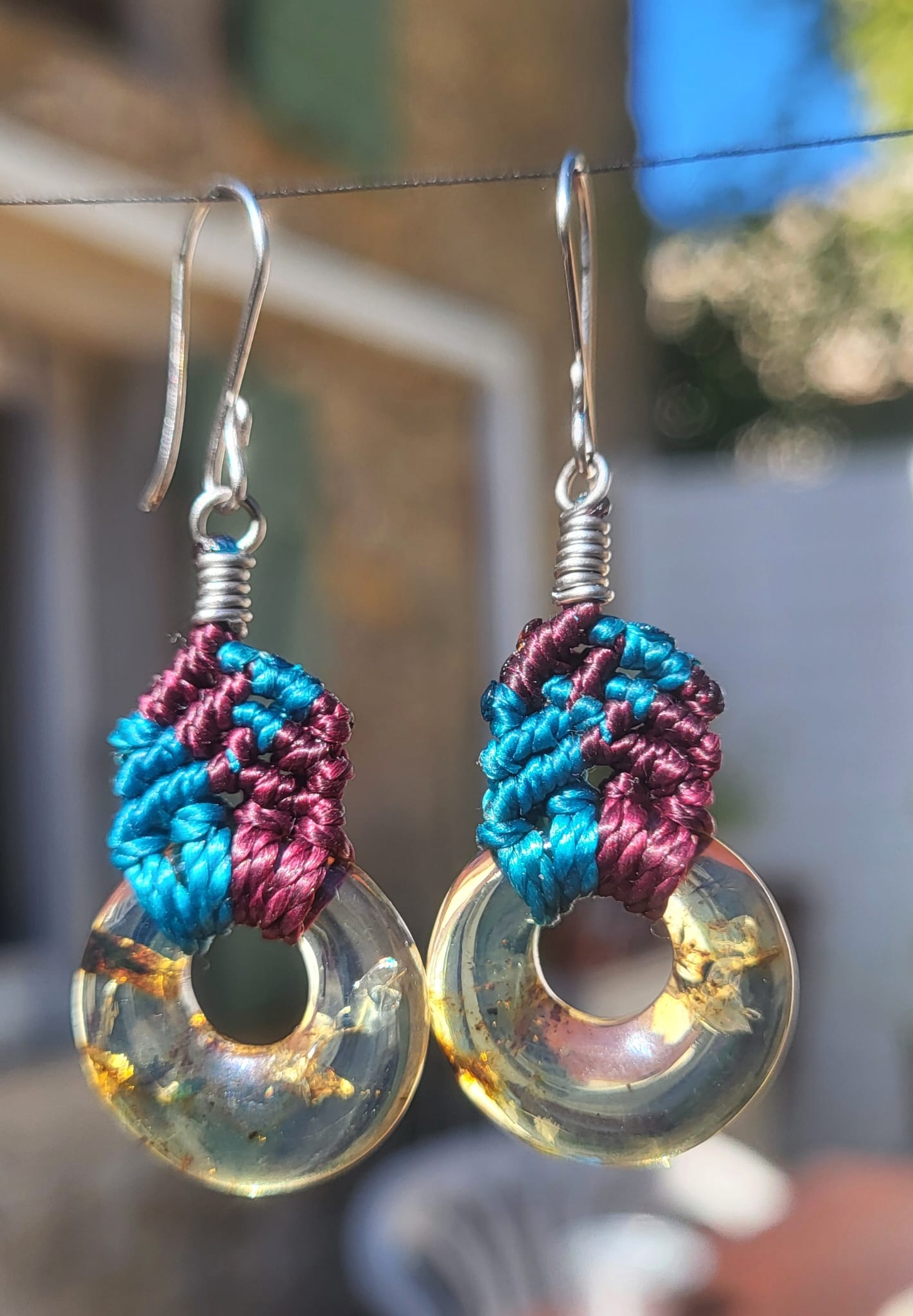 💎 Découvrez ces boucles d’oreilles aux cercles en ambre transparents fascinants ! Chaque pendentif révèle des inclusions dorées mystérieuses dans une matière cristalline hypnotique. Le macramé turquoise éclatant dialogue avec le bordeaux profond, créant un contraste chromatique saisissant. Les crochets en métal argenté avec leurs spires délicates complètent cette esthétique raffinée. Légères et confortables, elles transforment la lumière en spectacle coloré. Création artisanale mexicaine authentique, pièce unique certifiée.