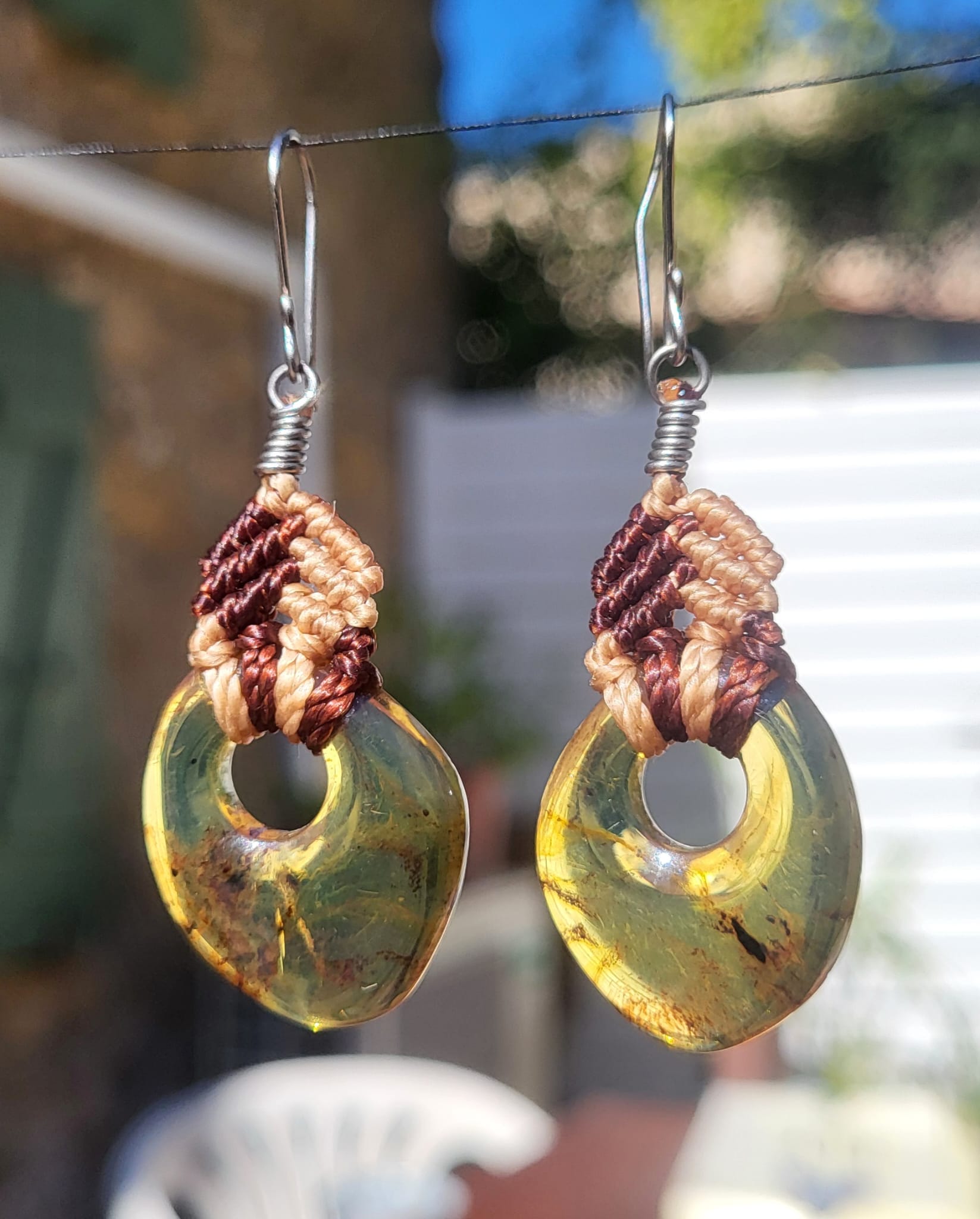 Découvrez ces sublimes boucles d’oreilles révélant un tressage macramé raffiné aux nuances beige naturel et bordeaux chaleureux. Les pendants ovales translucides aux reflets ambrés dorés présentent de mystérieuses inclusions sombres qui évoquent des fragments fossilisés. Chaque pièce unique témoigne du savoir-faire artisanal mexicain, alliant tradition ancestrale et esthétique contemporaine. Crochets en métal argenté pour un confort optimal. Une création authentique qui apporte chaleur et originalité à votre style.