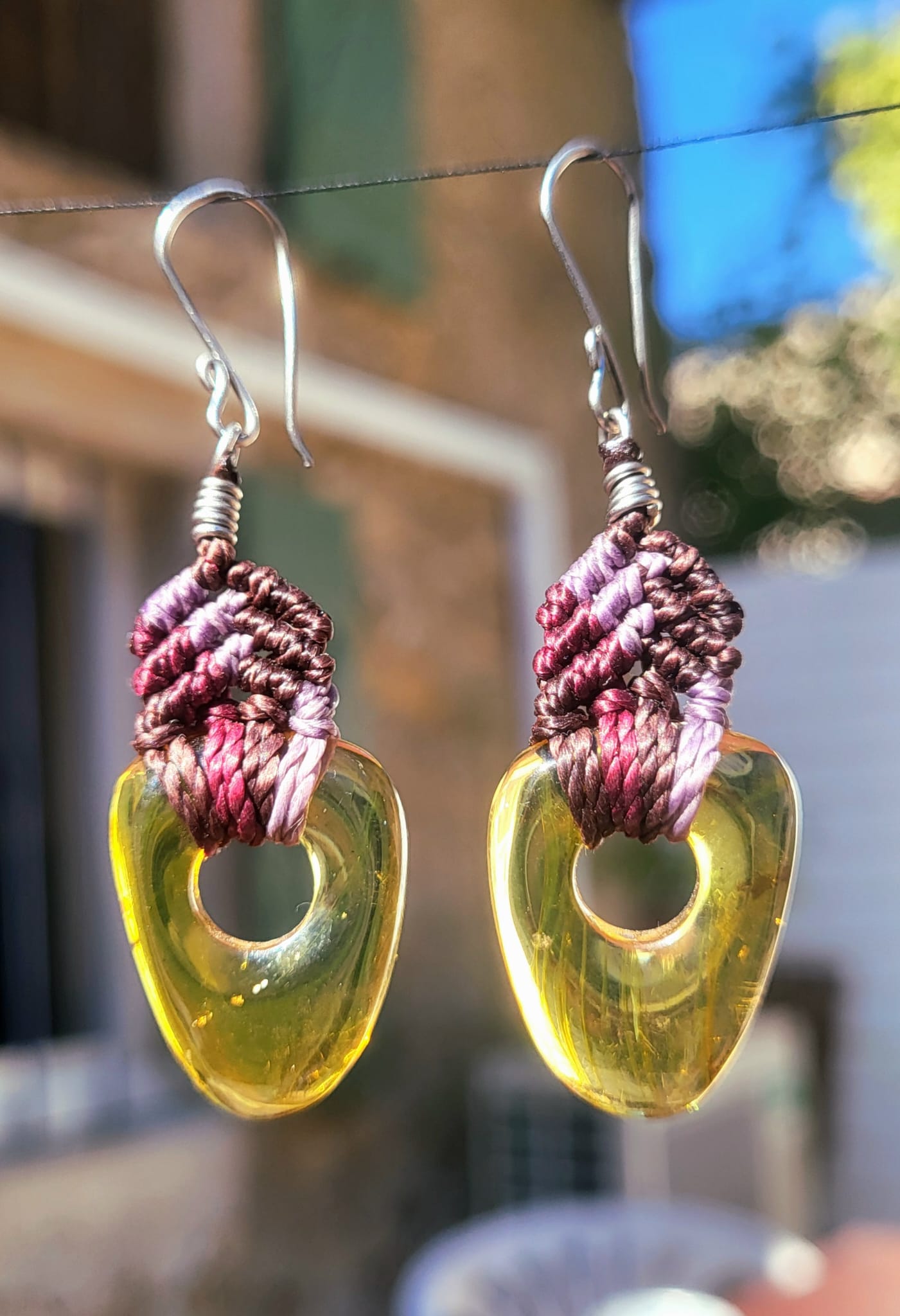 Découvrez ces boucles d’exception révélant un travail de macramé dégradé d’une subtilité remarquable. Les nuances roses, violettes et bordeaux s’entremêlent harmonieusement autour de pendentifs ovales en ambre translucides aux reflets dorés captivants. Les crochets en métal argenté assurent un confort optimal. Chaque pièce unique témoigne de la maîtrise artisanale mexicaine avec une élégance bohème raffinée.