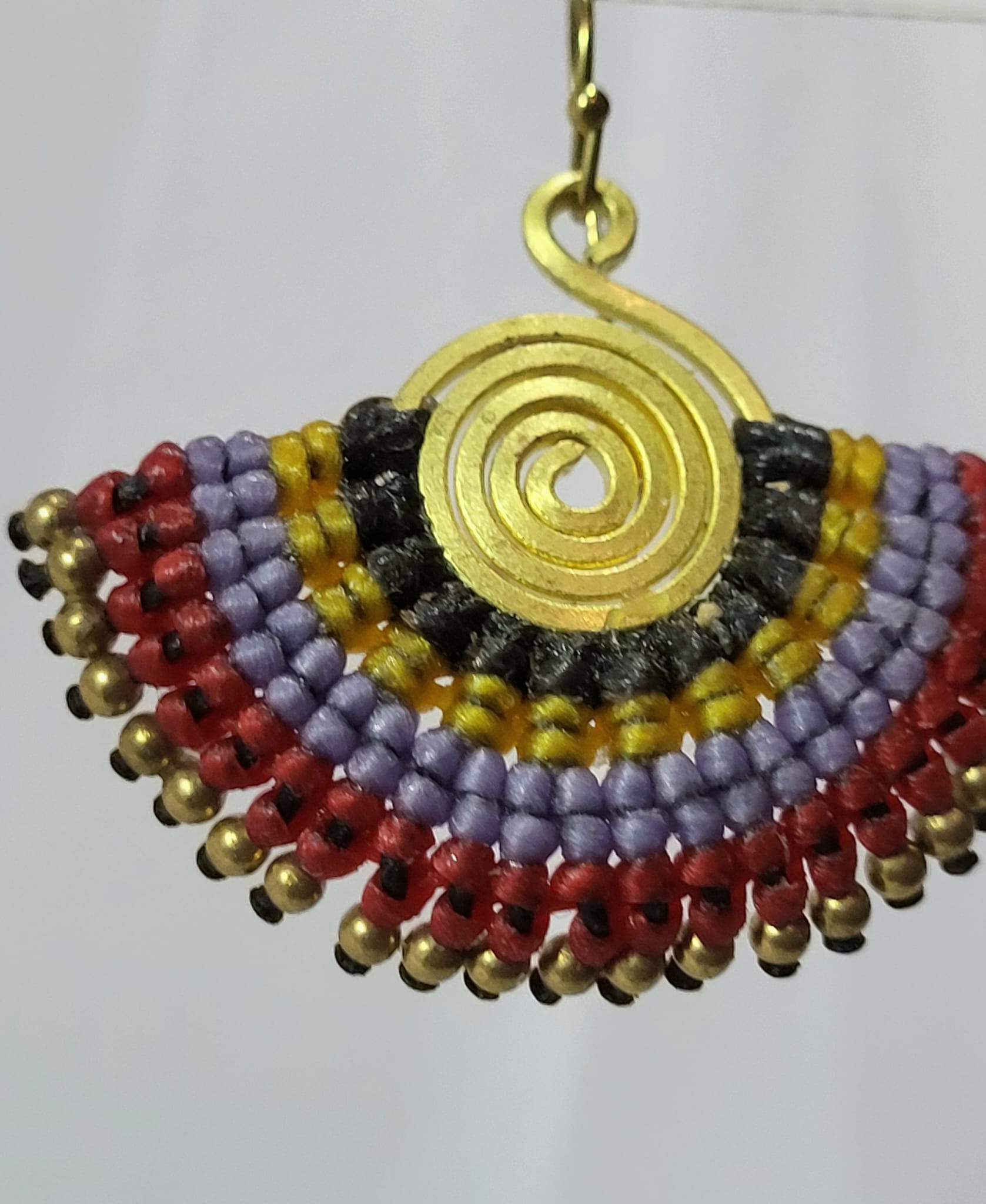 Boucles artisanales bronze et macramé fait main. Spirale en bronze, macramé lavande, rouge bordeaux, jaune et noir, frange de perles bronze. 4.8cm. Dégradé riche et profond. Chaque nœud noué à la main. 100% artisanat mexicain. Pièce unique. Livraison offerte.