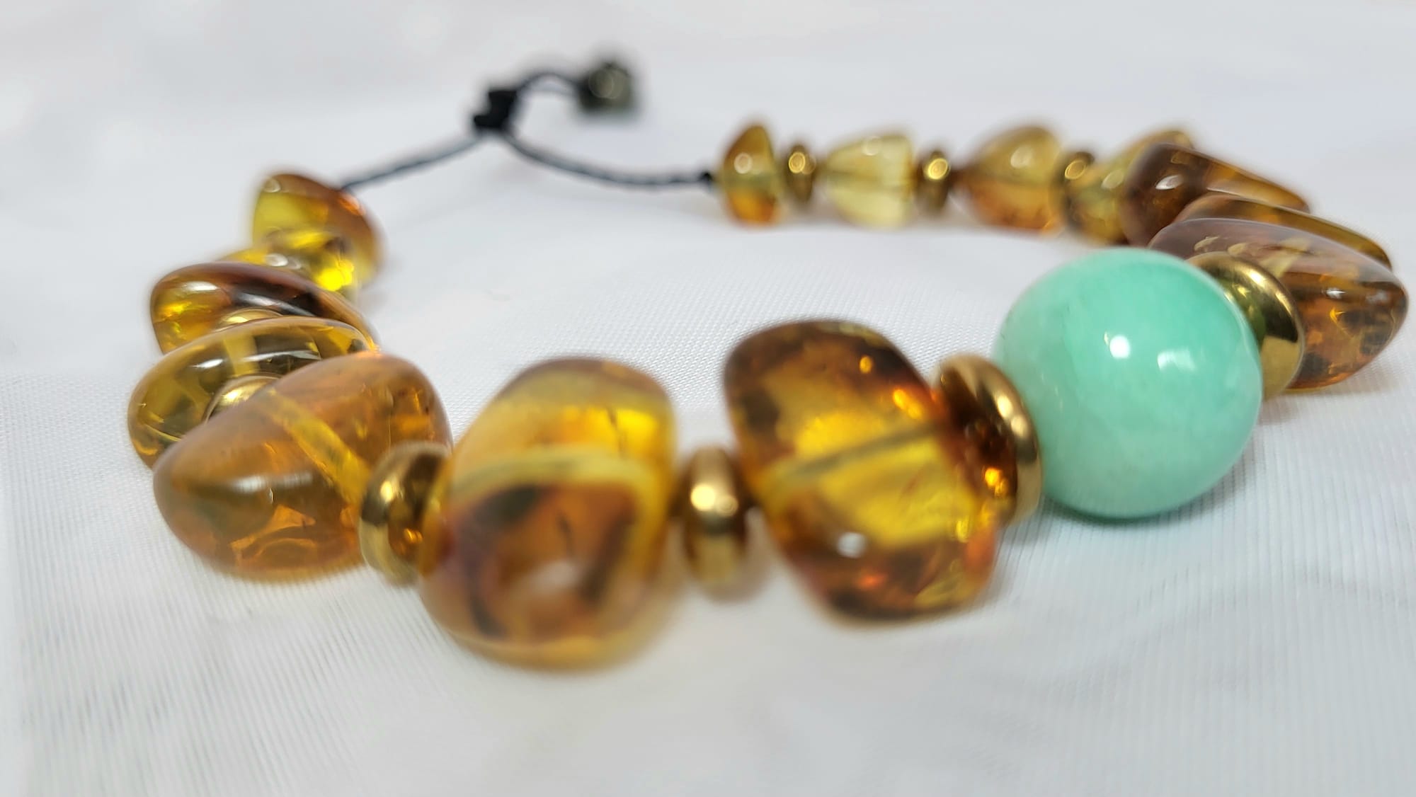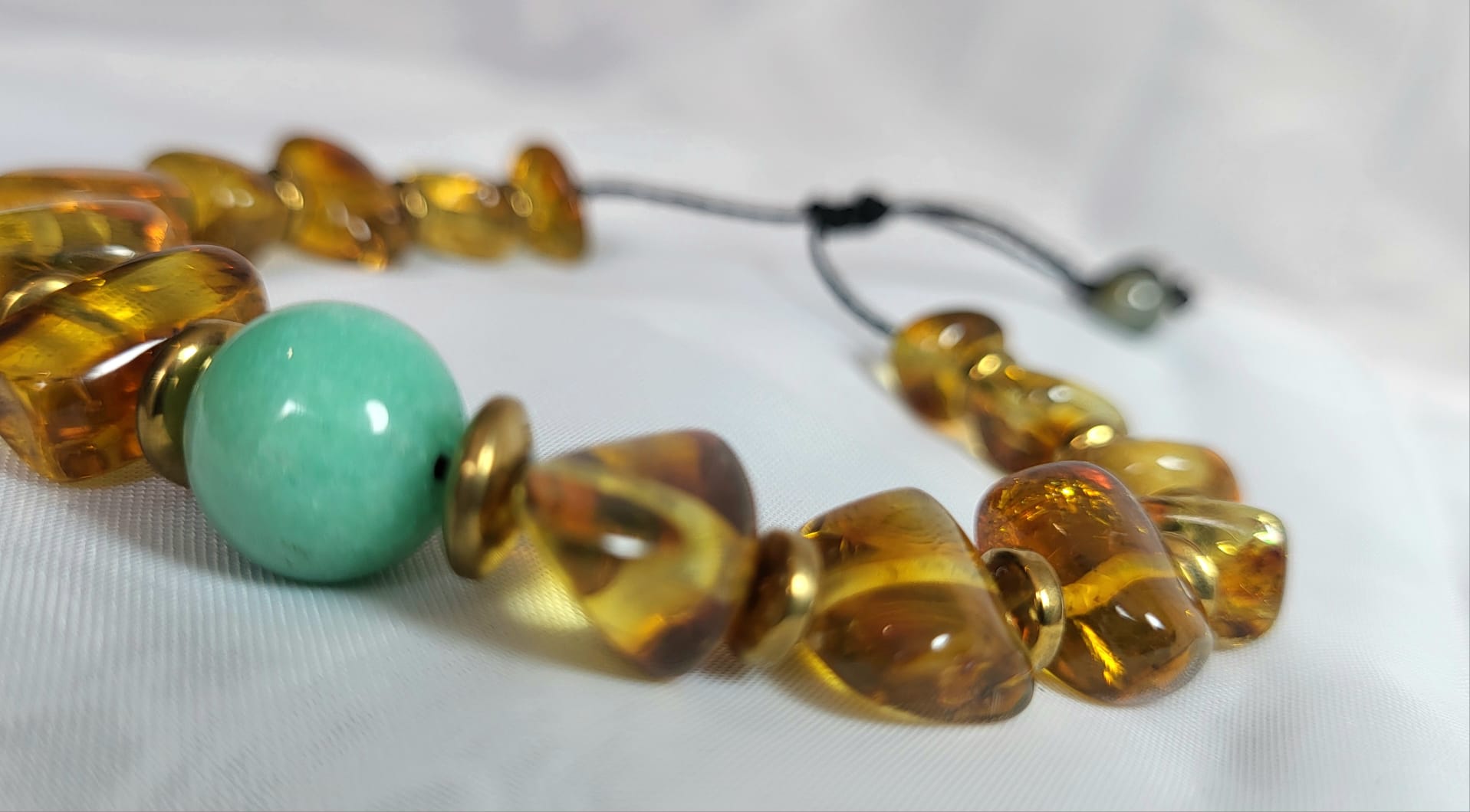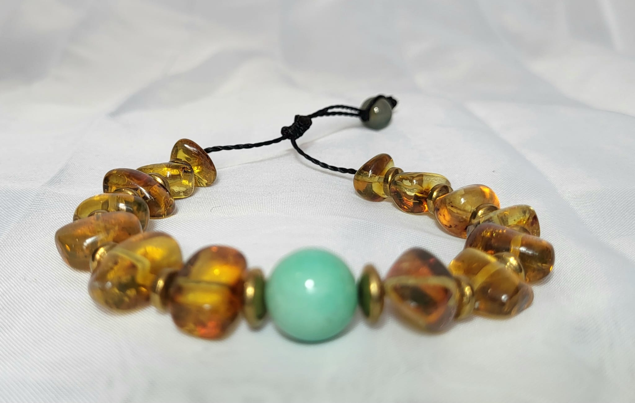 Ce bracelet est une rencontre : l’ambre doré du Chiapas — résine fossile de 25 millions d’années, chaude comme un soleil préhistorique — dialoguant avec l’amazonite bleu-turquoise, fraîche comme les eaux des Caraïbes mexicaines. Ces deux pierres naturelles ne sont pas seulement belles, elles se complètent énergétiquement — chaleur et fraîcheur, profondeur et légèreté. Assemblées et enfilées à la main par un artisan mexicain.