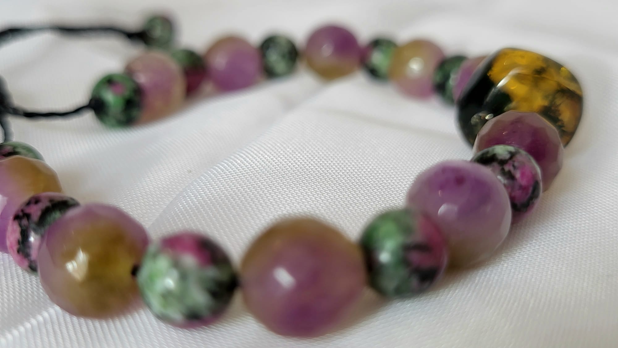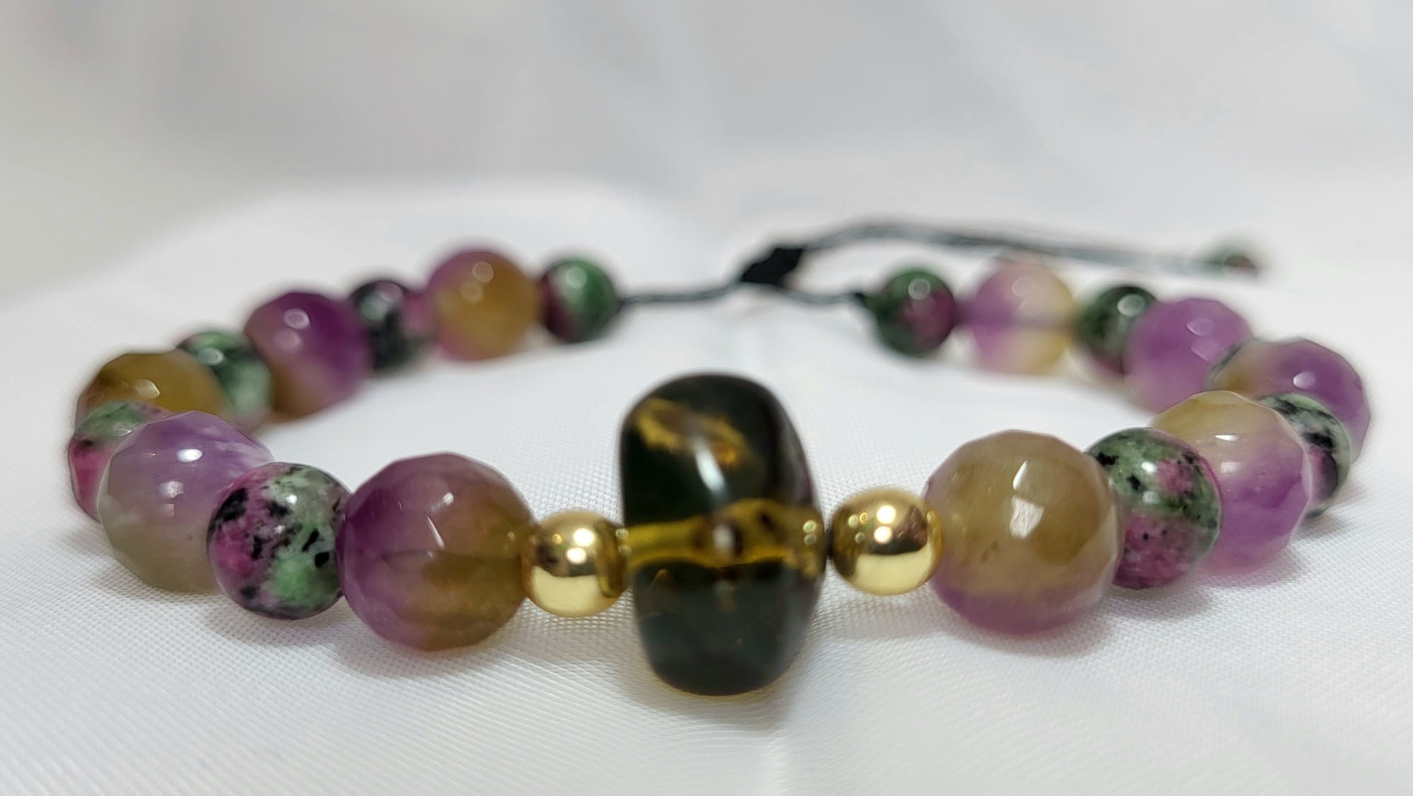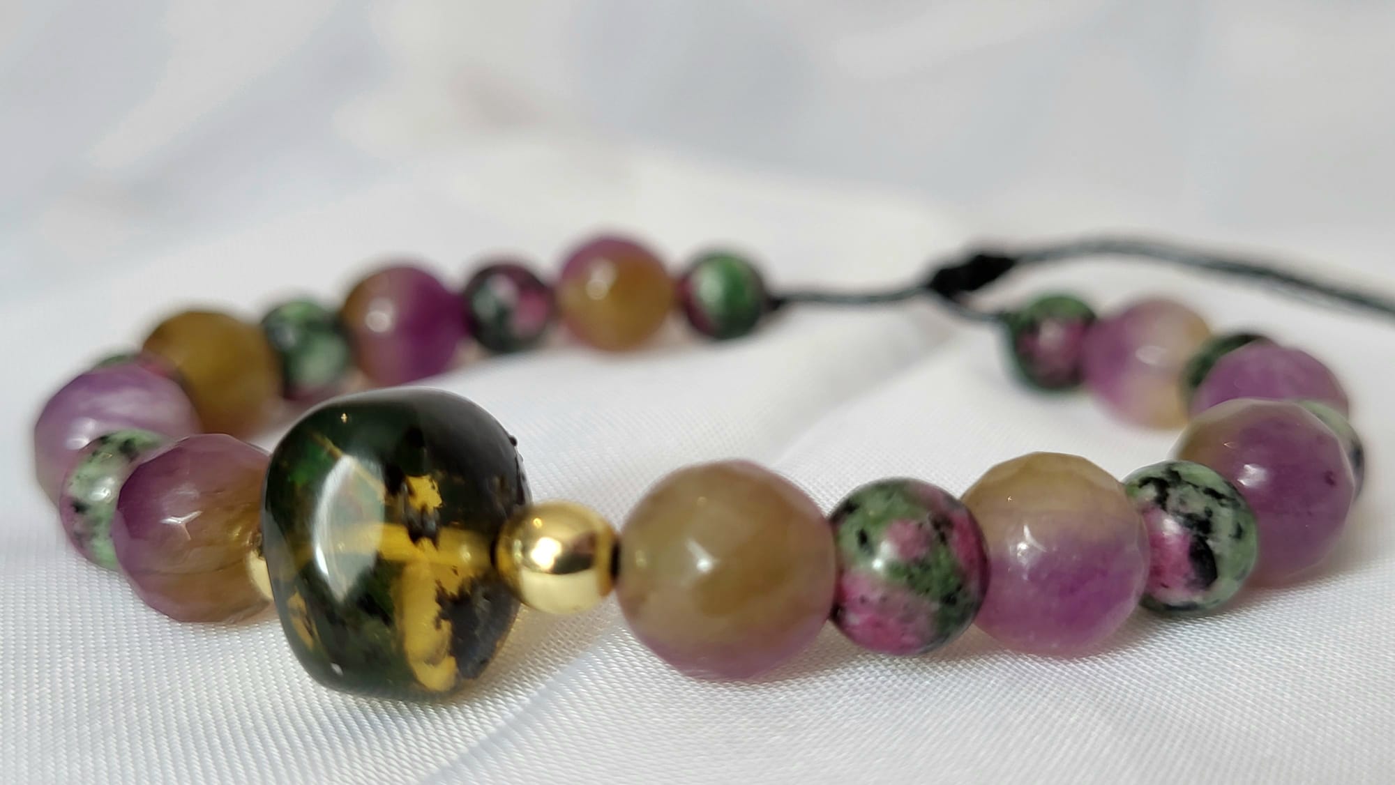 Ce second modèle de la collection ambre-rubis zoisite est, comme le premier, absolument irremplaçable — les perles de rubis zoisite sont si différentes les unes des autres qu’aucun bracelet ne peut ressembler à un autre. Celui-ci révèle des inclusions de rubis particulièrement intenses, des éclaboussures roses et rouges dans une matrice verte profonde, alternées avec l’ambre doré translucide du Chiapas. Un bijou pour qui sait apprécier la beauté brute et authentique de la nature.