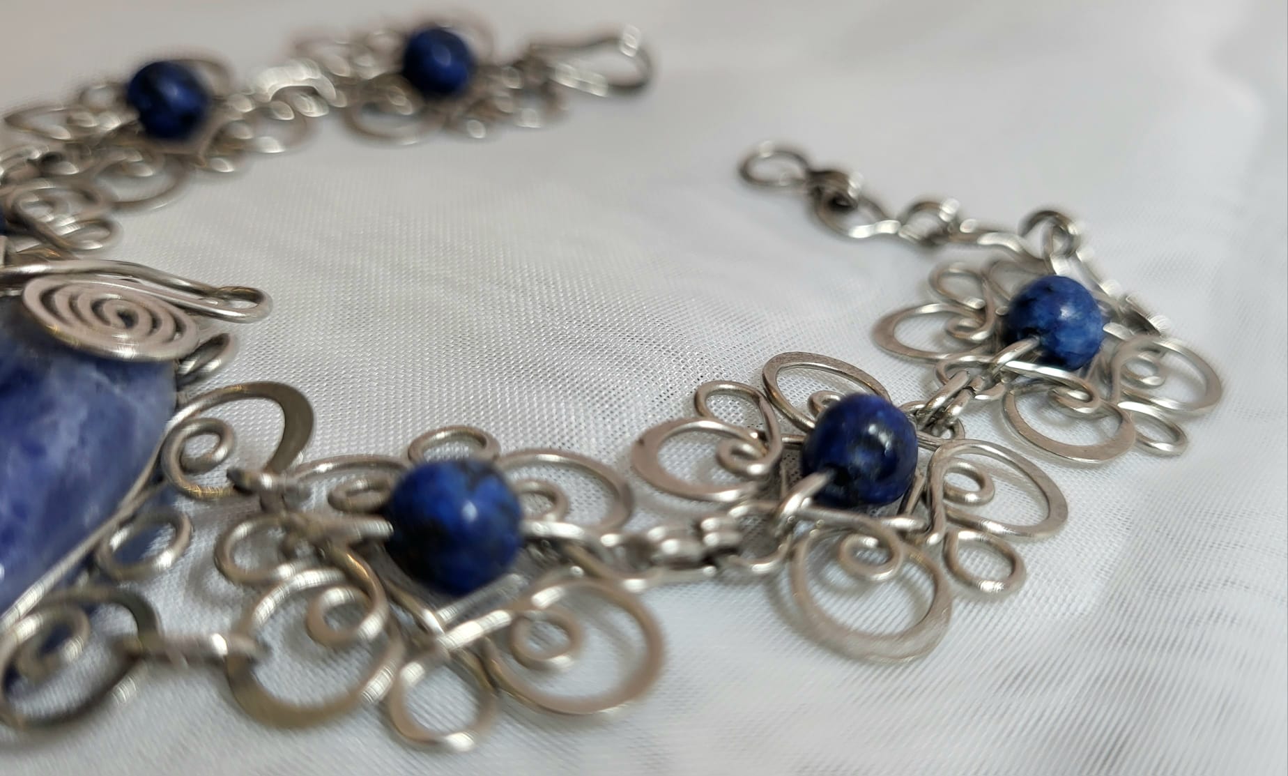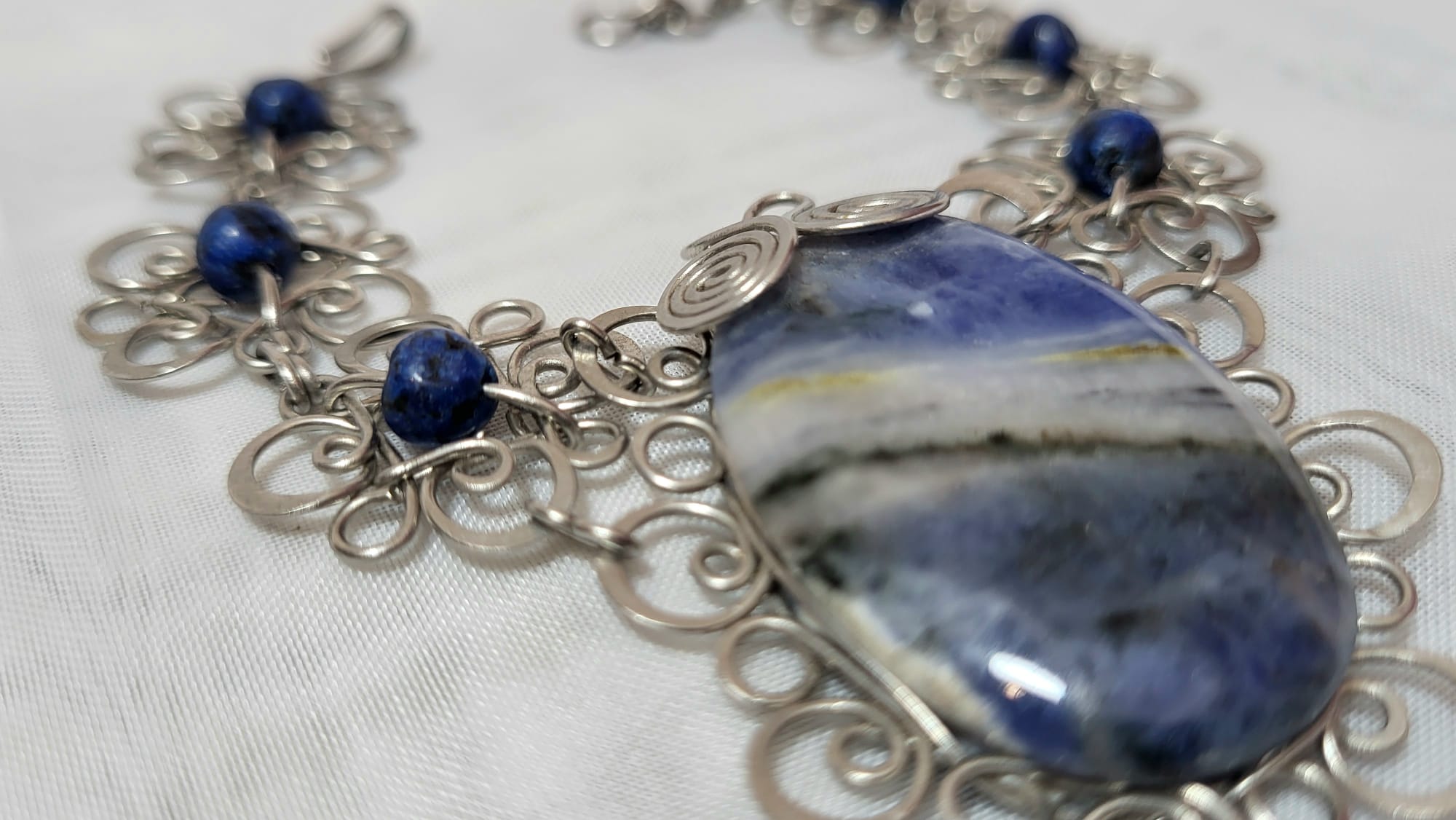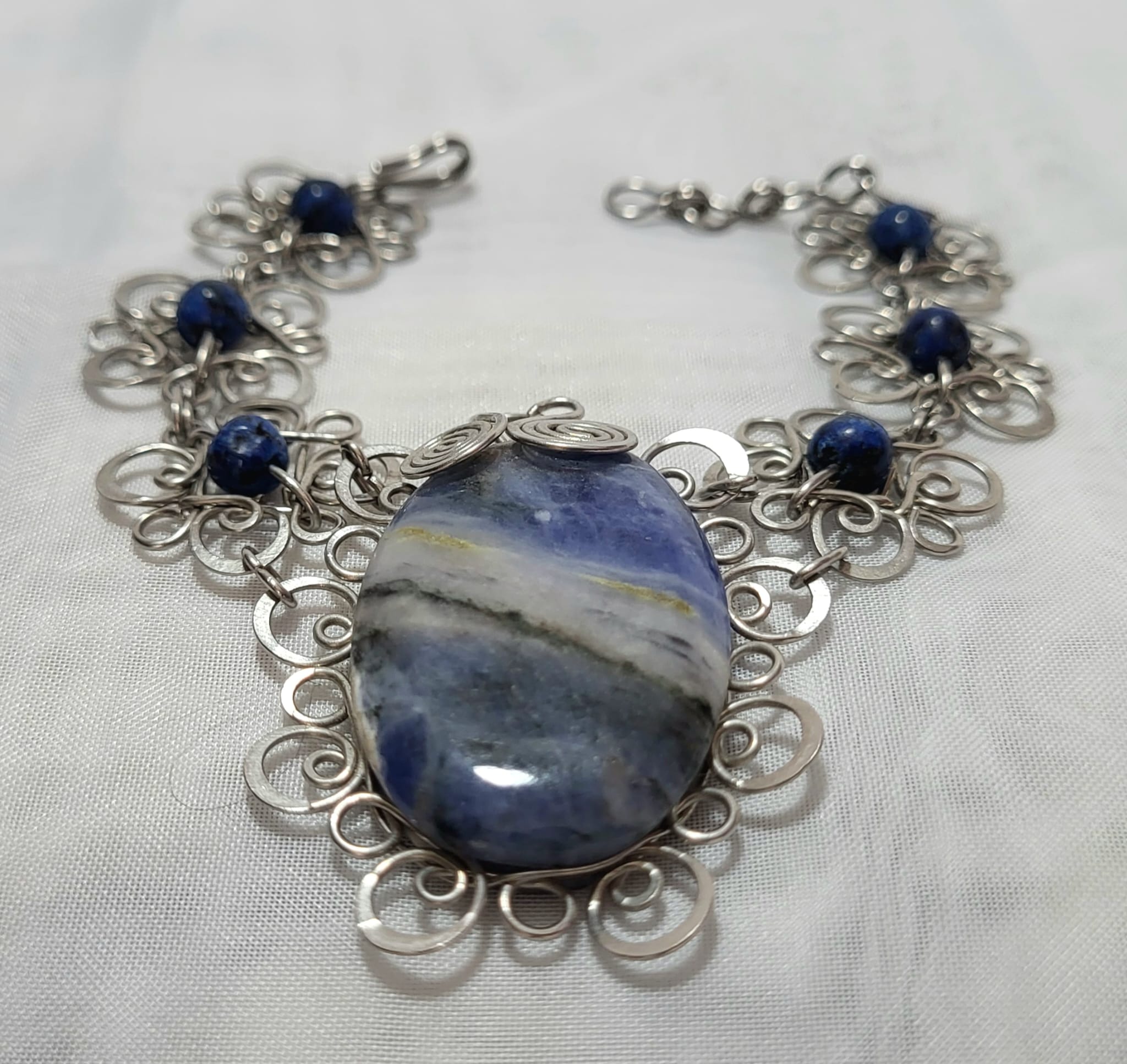Ce bracelet est le résultat de heures de travail minutieux aux mains d’un joaillier mexicain qui maîtrise l’art du filigrane — cette technique ancienne qui consiste à façonner des fils de métal en volutes, spirales et arabesques serrées les unes contre les autres. Au centre trône un imposant cabochon de sodalite bleue facetté (4cm), entouré de perles de sodalite qui prolongent sa couleur profonde tout au long du bracelet. Une pièce de joaillerie artisanale qui n’a rien à envier aux grandes maisons.