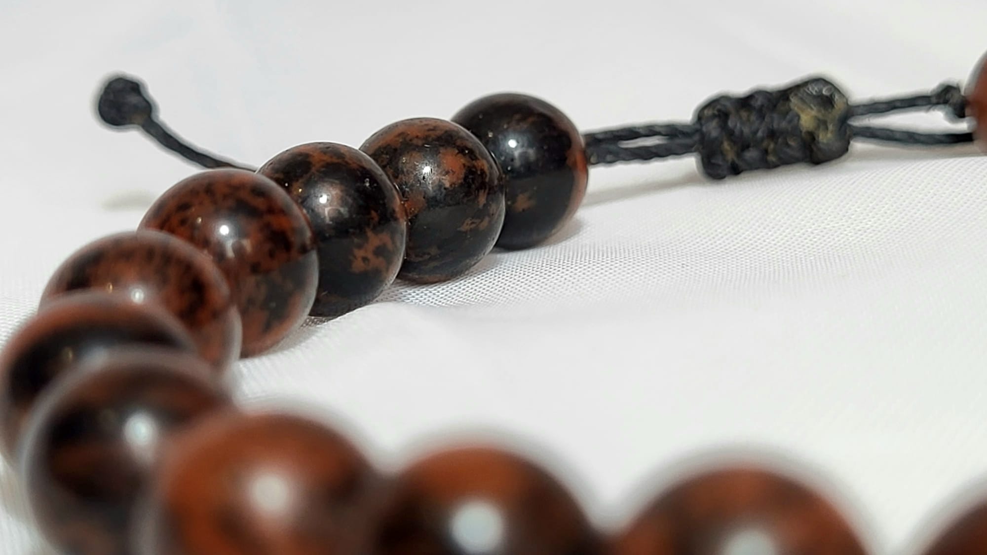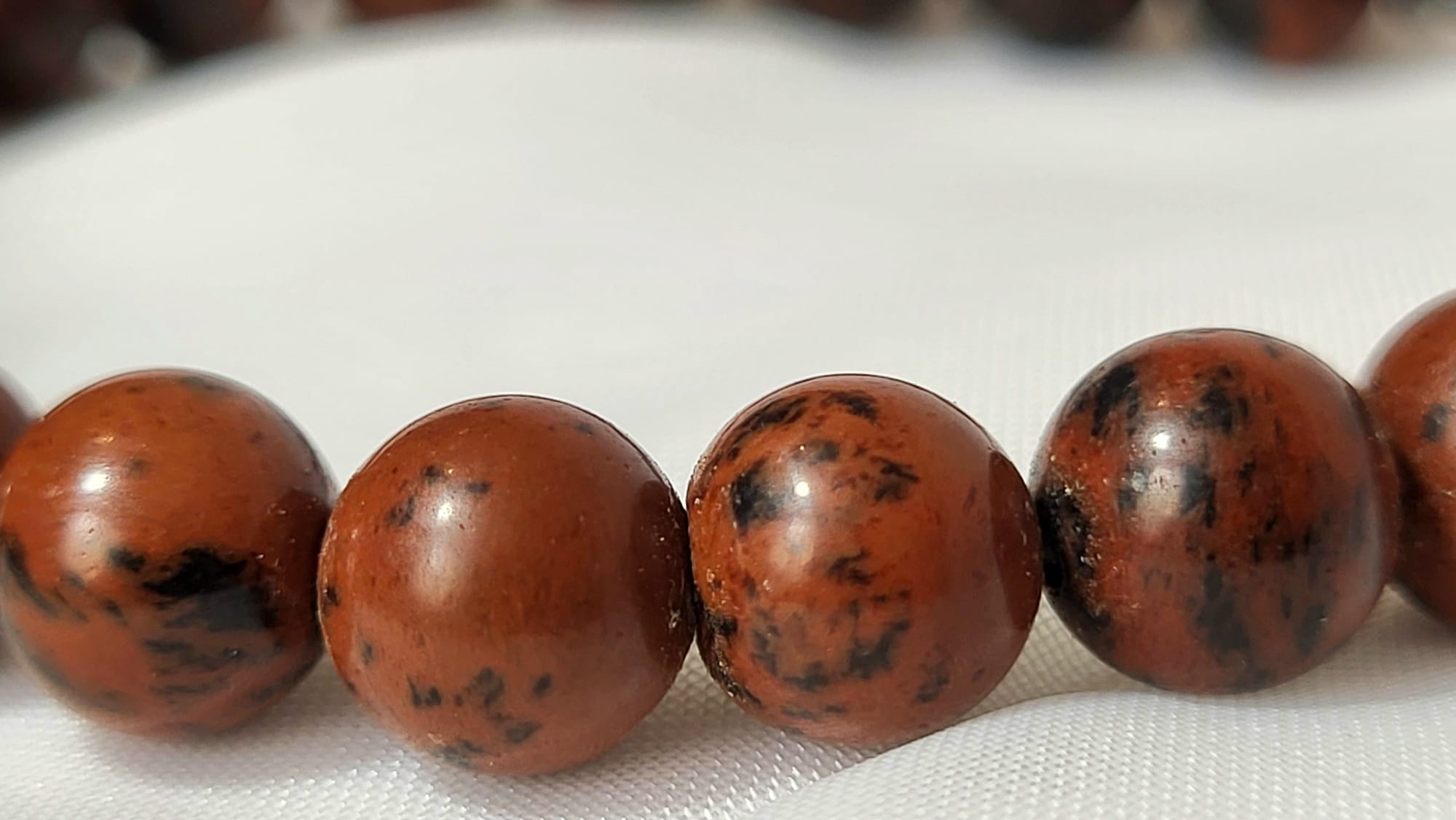 L’obsidienne acajou est une variété rare de l’obsidienne noire — au lieu d’un noir absolu, le magma mexicain a créé ici un verre volcanique taché de brun acajou et de cuivré, des inclusions de fer et de magnésium qui dessinent des galaxies organiques dans la pierre. Pierre d’ancrage profond, elle invite à revenir à la terre, à retrouver sa force intérieure après les tempêtes. Polie et enfilée main par un artisan mexicain qui connaît la puissance des volcans de son pays.