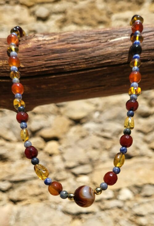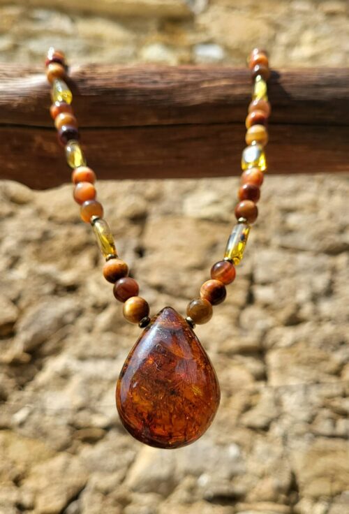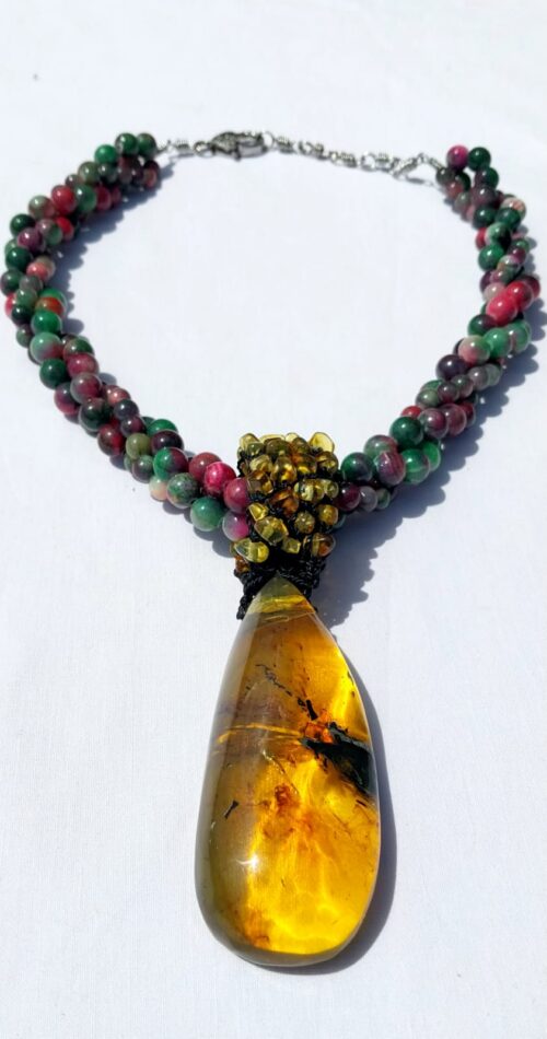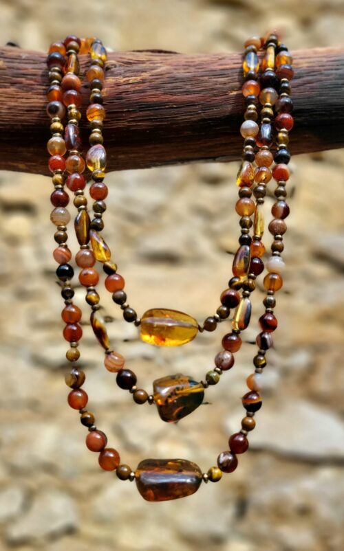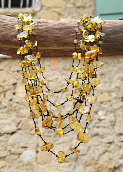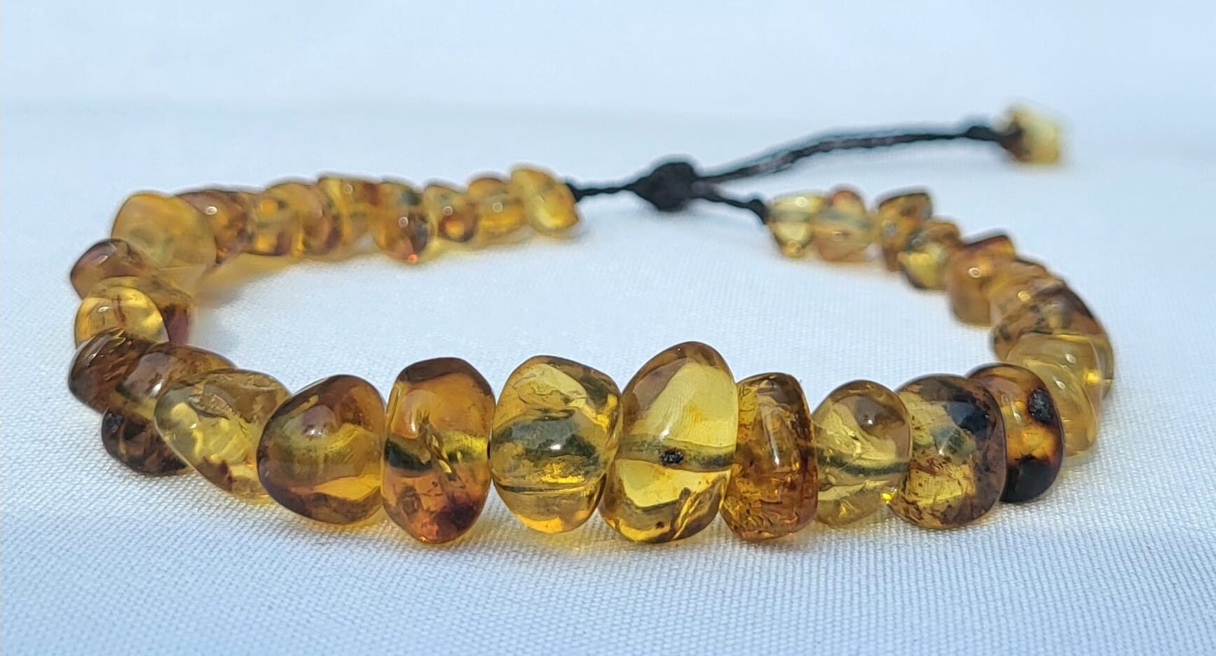 Découvrez ce bracelet d’exception célébrant la beauté brute de la nature. Chaque perle dorée translucide en ambre aux formes naturelles irrégulières révèle des inclusions organiques fascinantes – fragments végétaux, structures naturelles emprisonnées dans la transparence dorée. Cette approche respectueuse de la forme naturelle crée un ensemble d’une authenticité saisissante. Aucune pierre ne ressemble à une autre, chaque spécimen raconte son histoire géologique unique. Cordon ajustable noir avec finitions artisanales mexicaines.