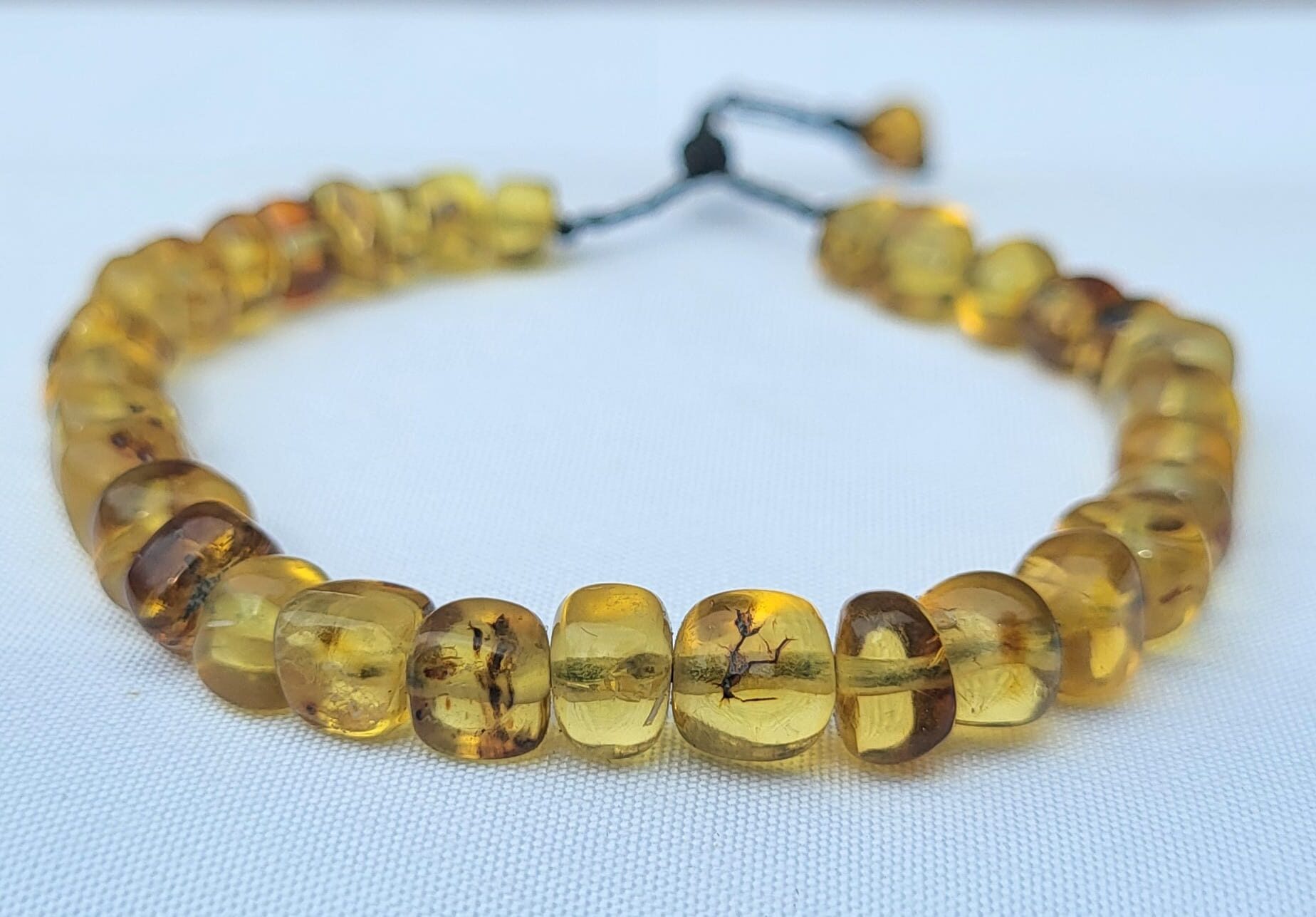 Découvrez ce bracelet d’exception aux perles translucides dorées en ambre du Chiapas contenant de remarquables inclusions naturelles évoquant l’univers fossile. Chaque pierre révèle des fragments d’histoire naturelle emprisonnés dans la matière translucide – végétaux, éléments organiques suspendus dans le temps. Cette collection paléontologique miniature transforme le bracelet en véritable musée portable. Formes géométriques variées. Cordon ajustable noir avec finitions artisanales mexicaines soignées.