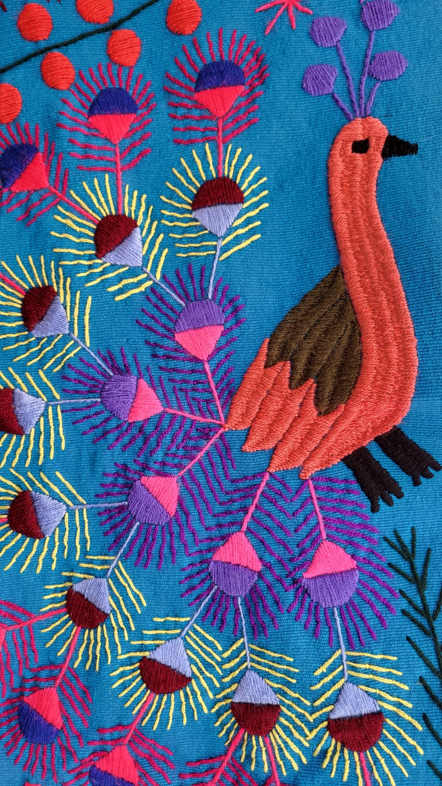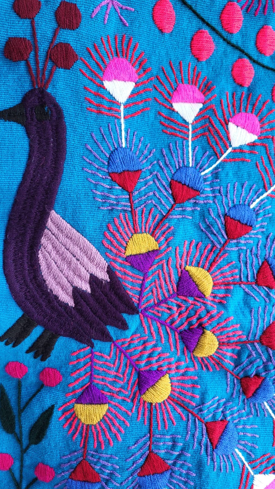 Deux paons (Pavo Real) aux queues déployées se font face, brodés de fils rose fuchsia, violet, rouge et multicolore. Des petites fleurs stylisées et des branches fines ornent l’ensemble. Le contraste entre le fond bleu profond et les broderies roses et violettes crée un effet très graphique, contemporain et séduisant.