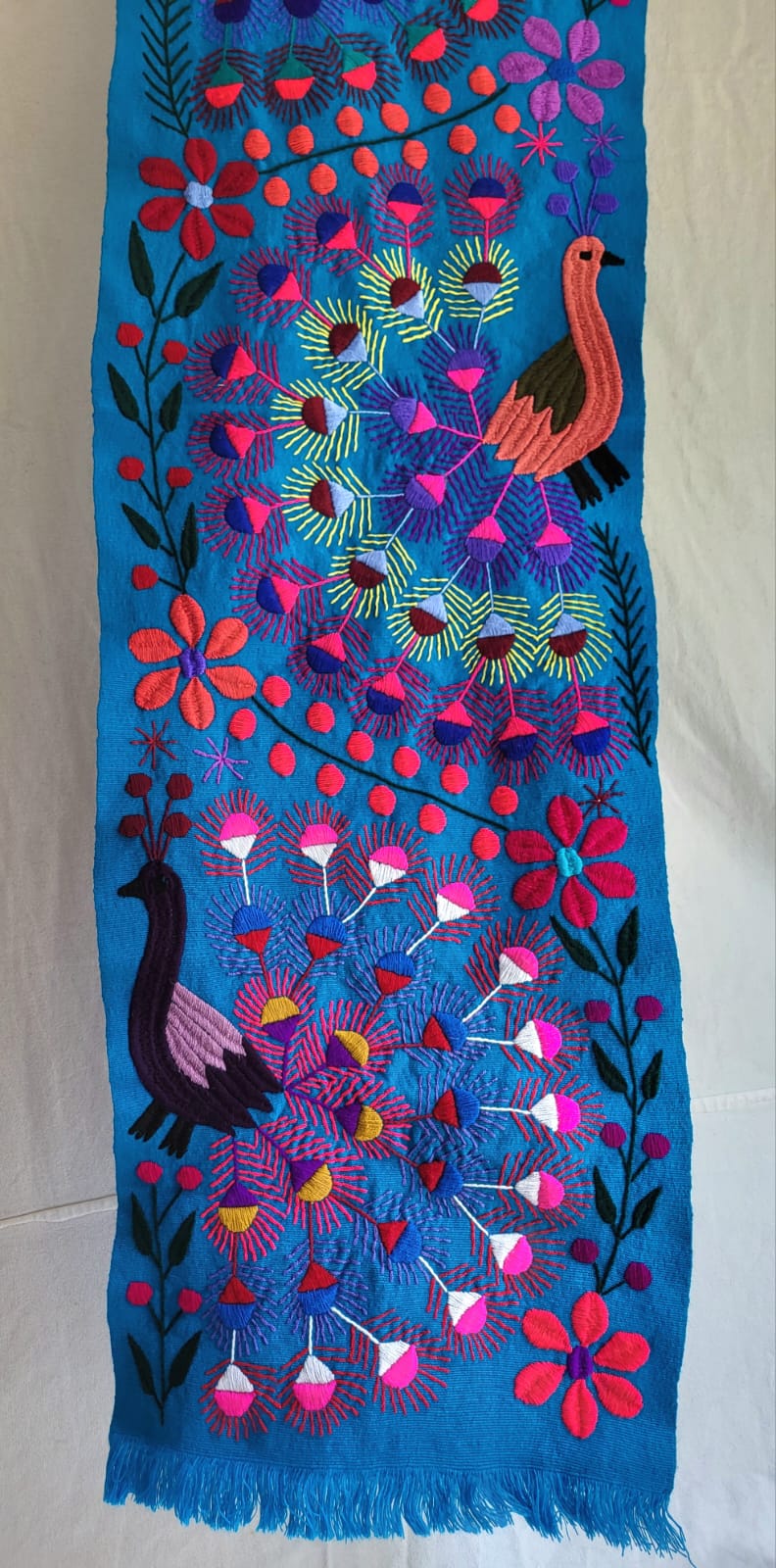 Broderie artisanale du Chiapas — Chemin de table graphique et élégant brodé à l’aiguille à la main sur coton tissé bleu sarcelle/canard.