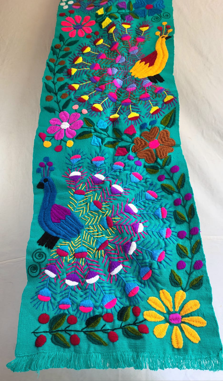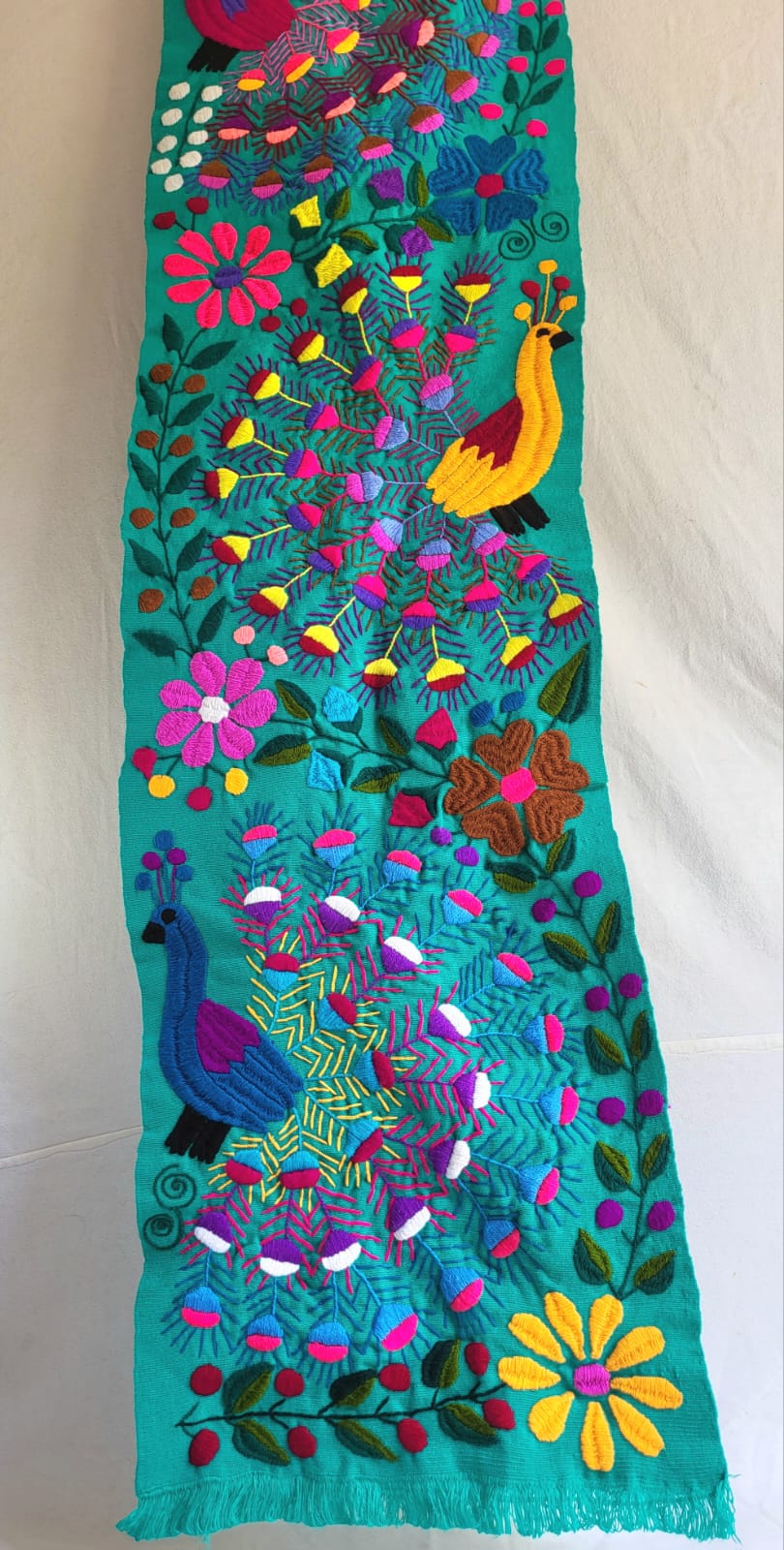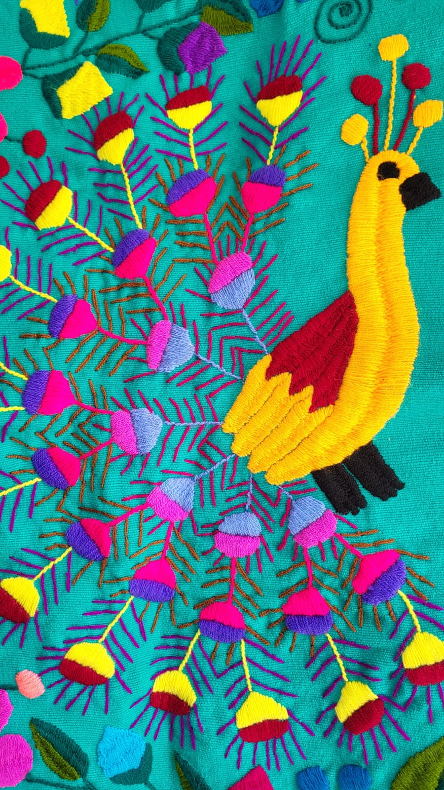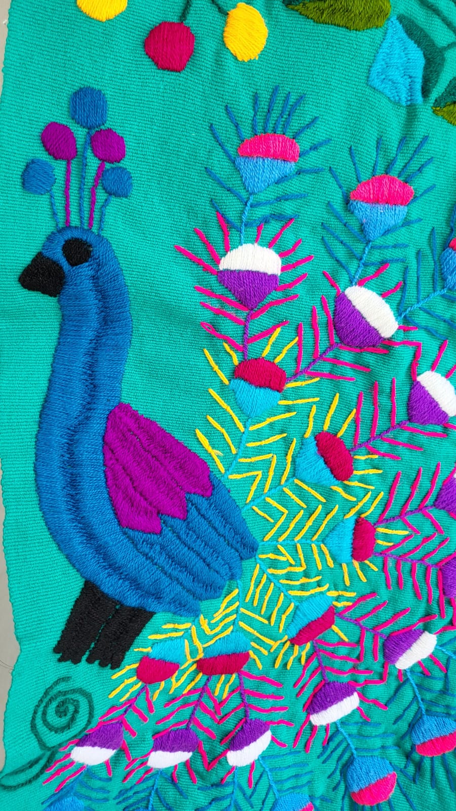 Broderie Chiapas Vert Turquoise Paon Fait Main 173cm