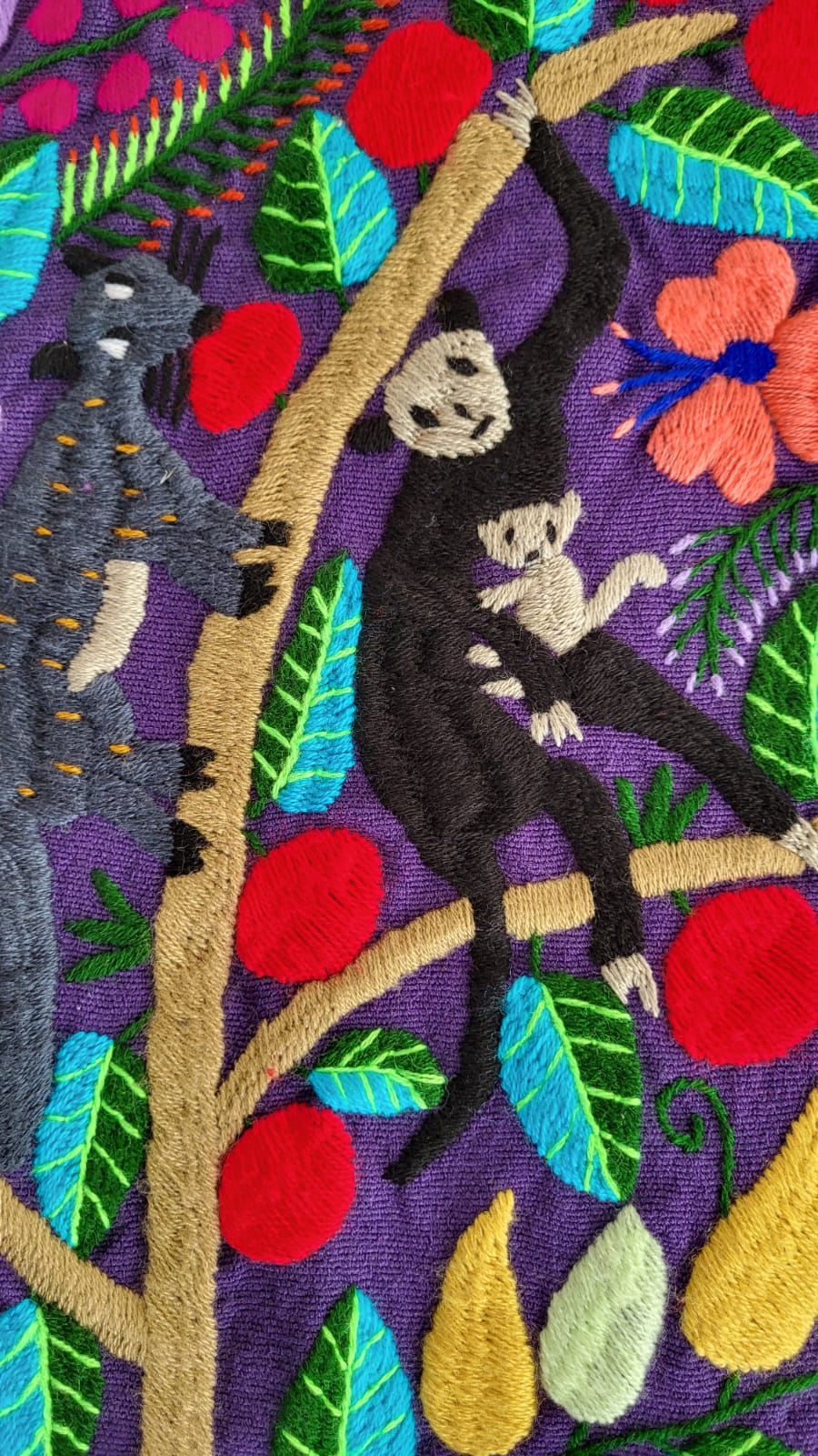 Deux paons (Pavo Real) aux queues déployées en éventail dominent la composition : l’un brodé en fils jaune et orange, l’autre en violet et bleu, sur un fond turquoise qui évoque la nature tropicale mexicaine. Des fleurs roses, jaunes et violettes et des branchages verts complètent ce tableau vivant.