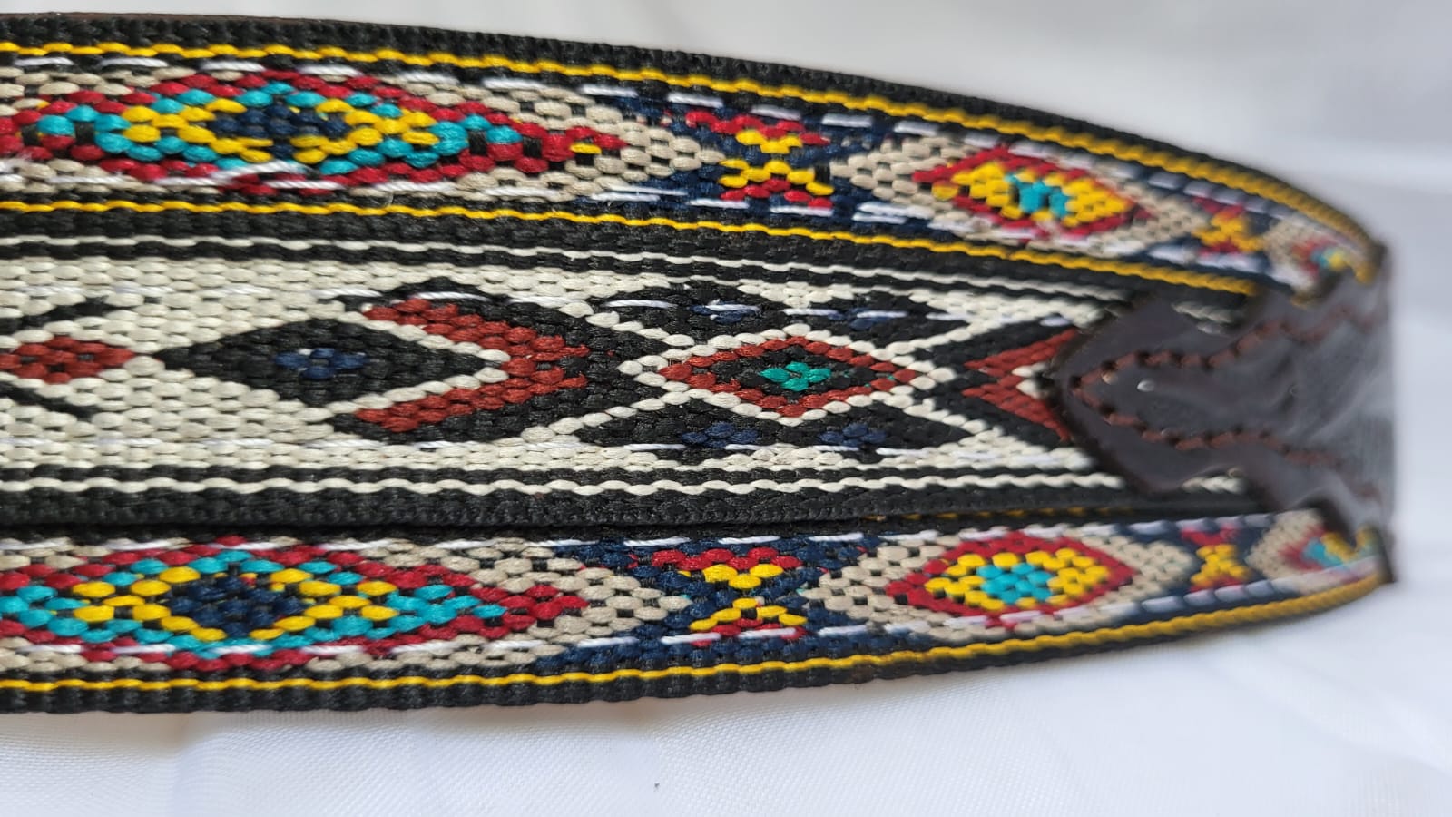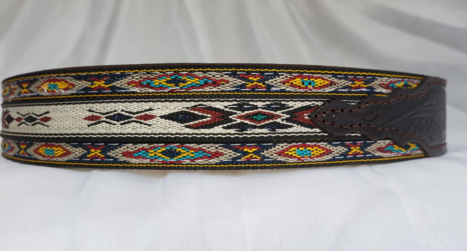 Ceinture en cuir pleine fleur ornée d’une tissage artisanal traditionnelle mexicaine. Chaque motif est réalisé à la main avec des fils colorés, créant un contraste saisissant entre la robustesse du cuir et la finesse de le tissage.