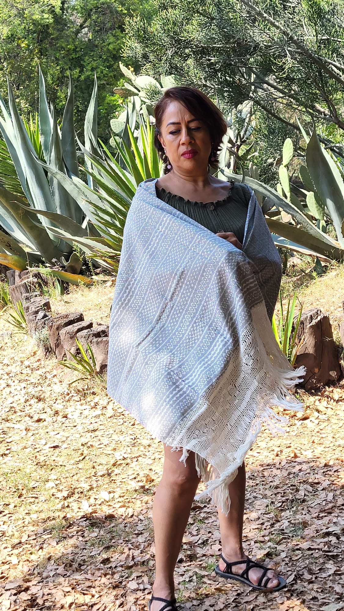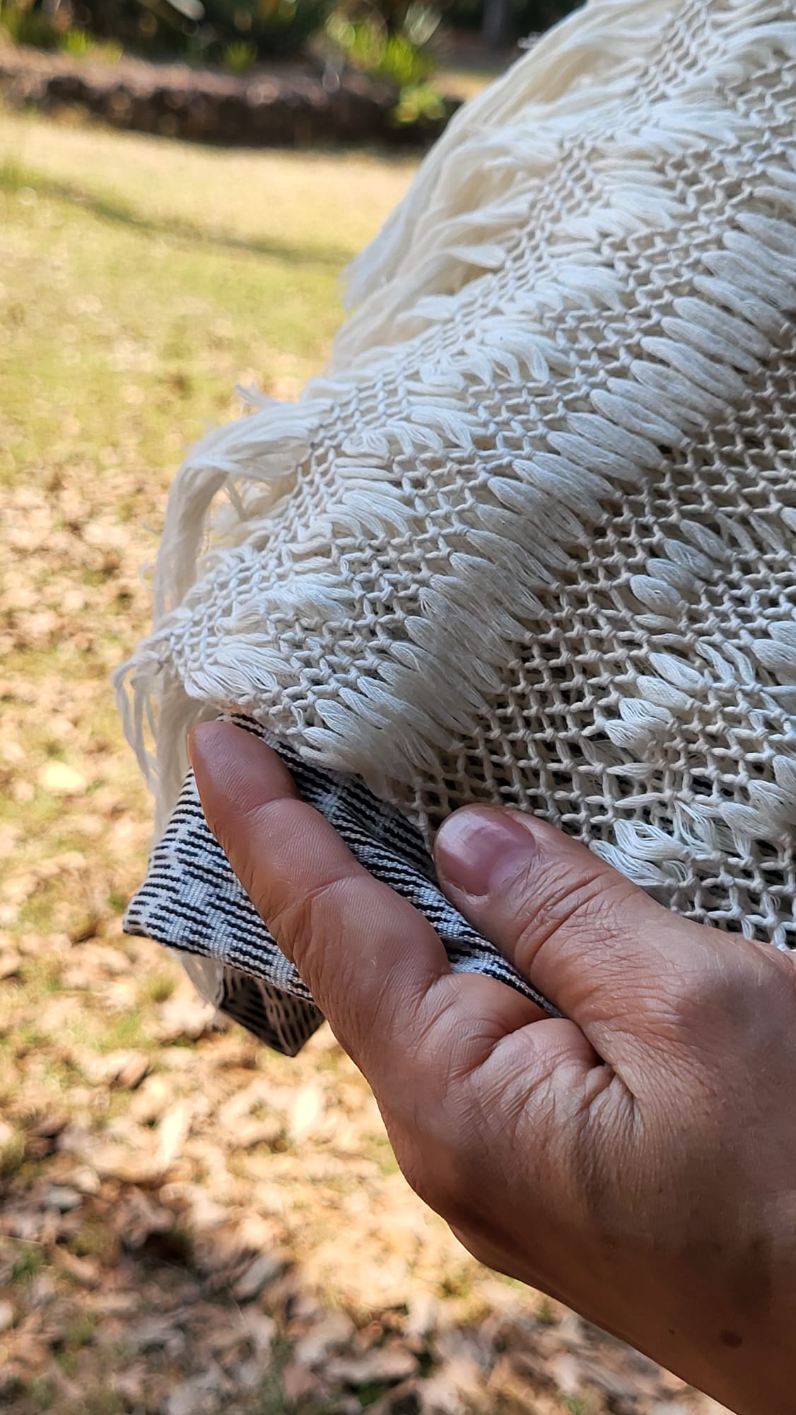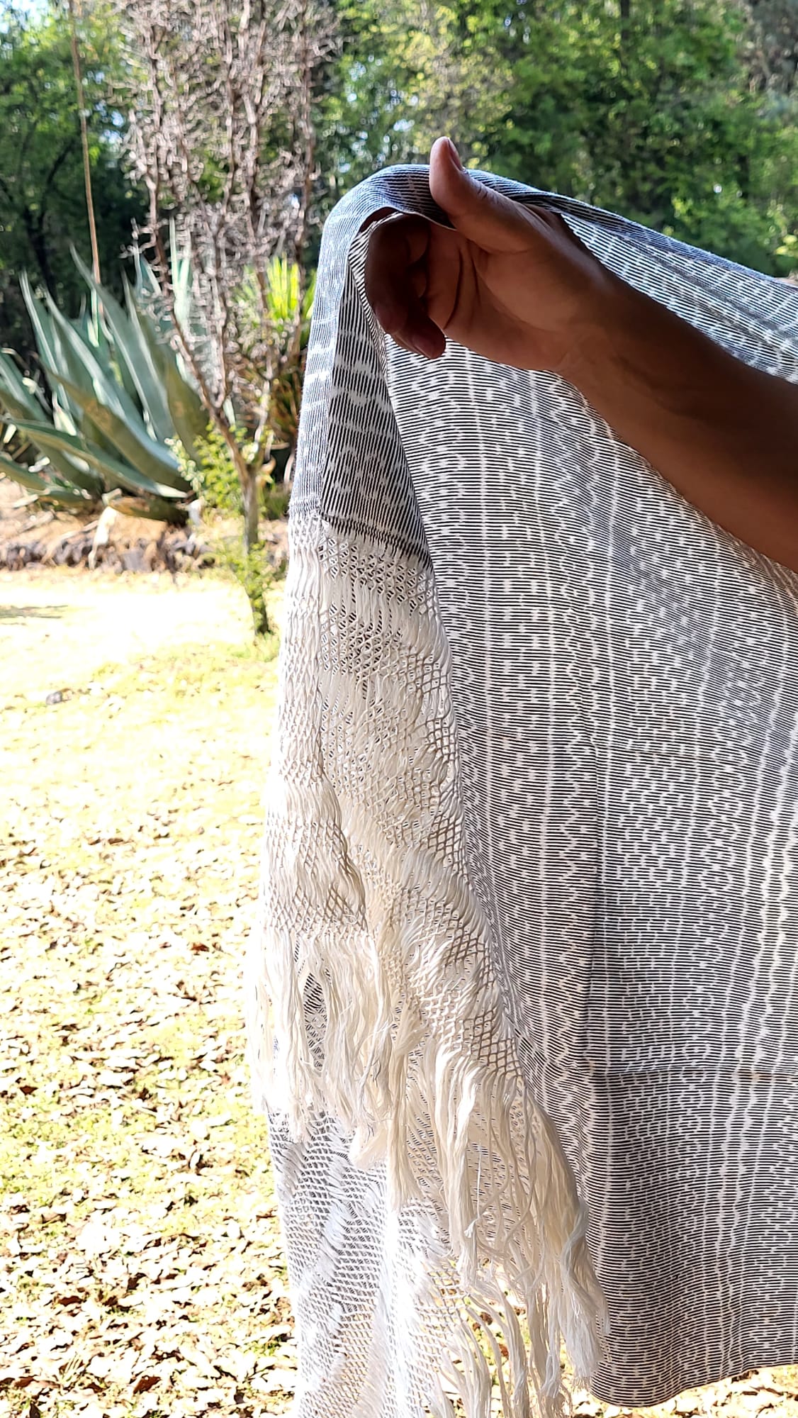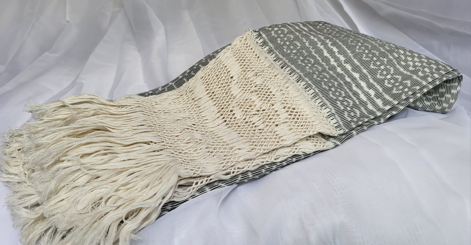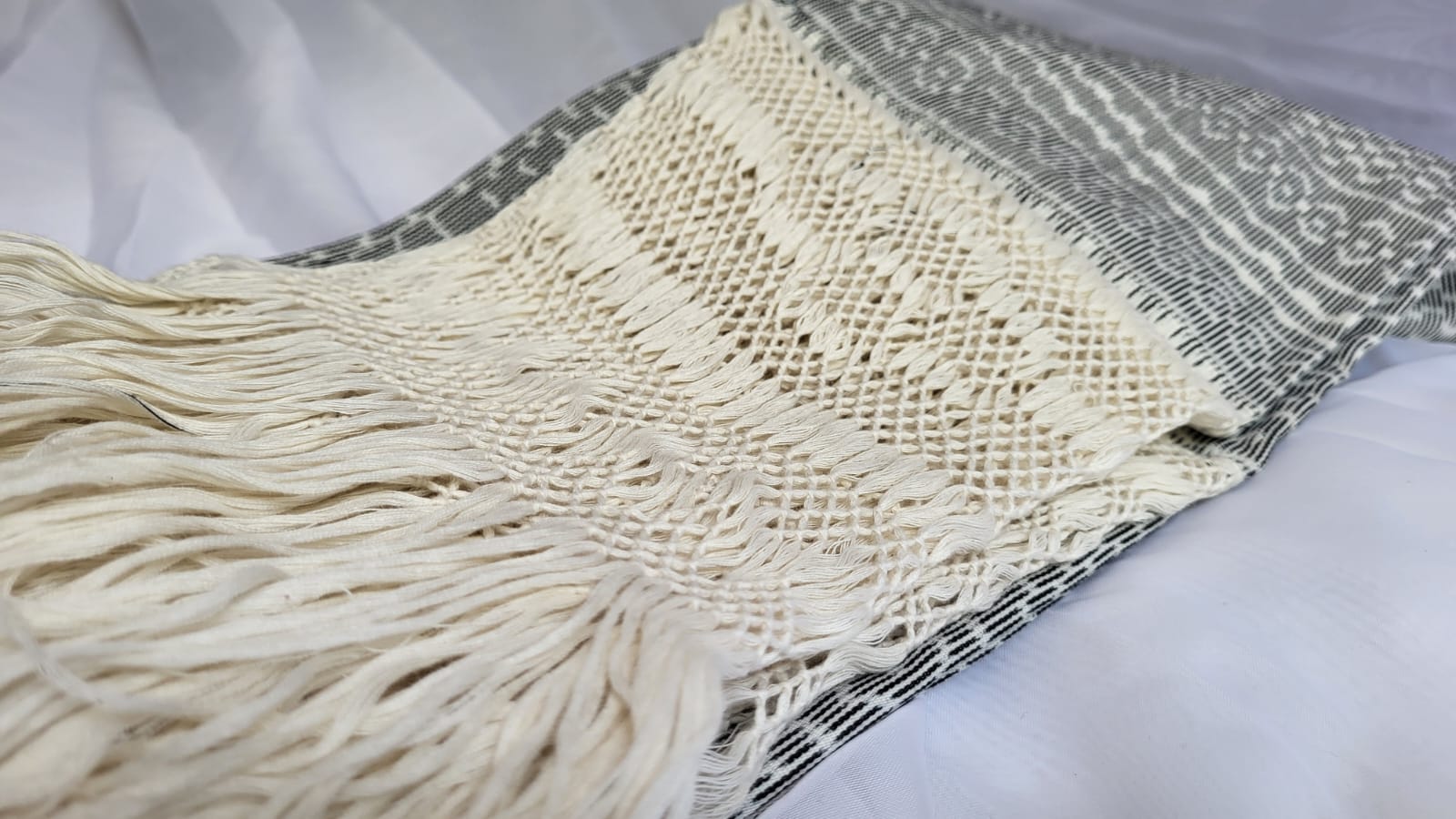 Châle foulard mexicain beige et blanc – quand deux couleurs racontent le Mexique. Tissé sur métier debout traditionnel, ce châle en pur coton entrelace deux teintes fil par fil, chaque fil assemblé à la main. Les franges rapacejo sont nouées selon des motifs géométriques ancestraux qui nécessitent plusieurs jours de travail minutieux.