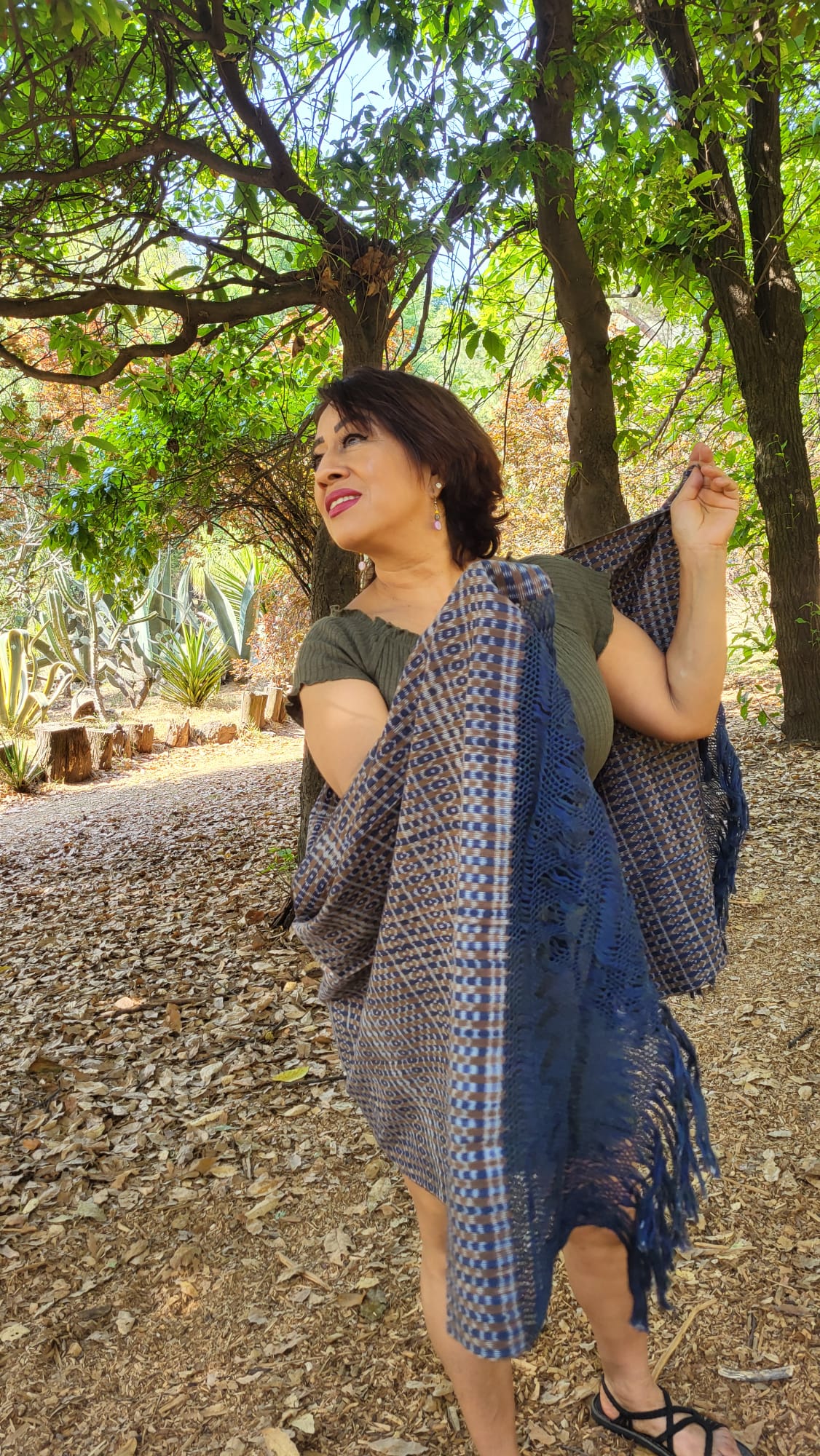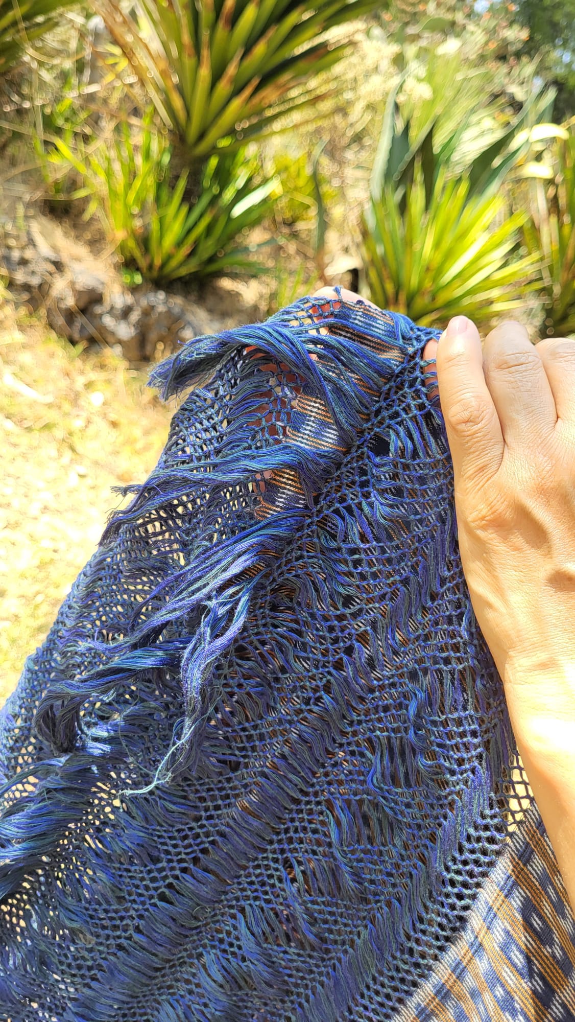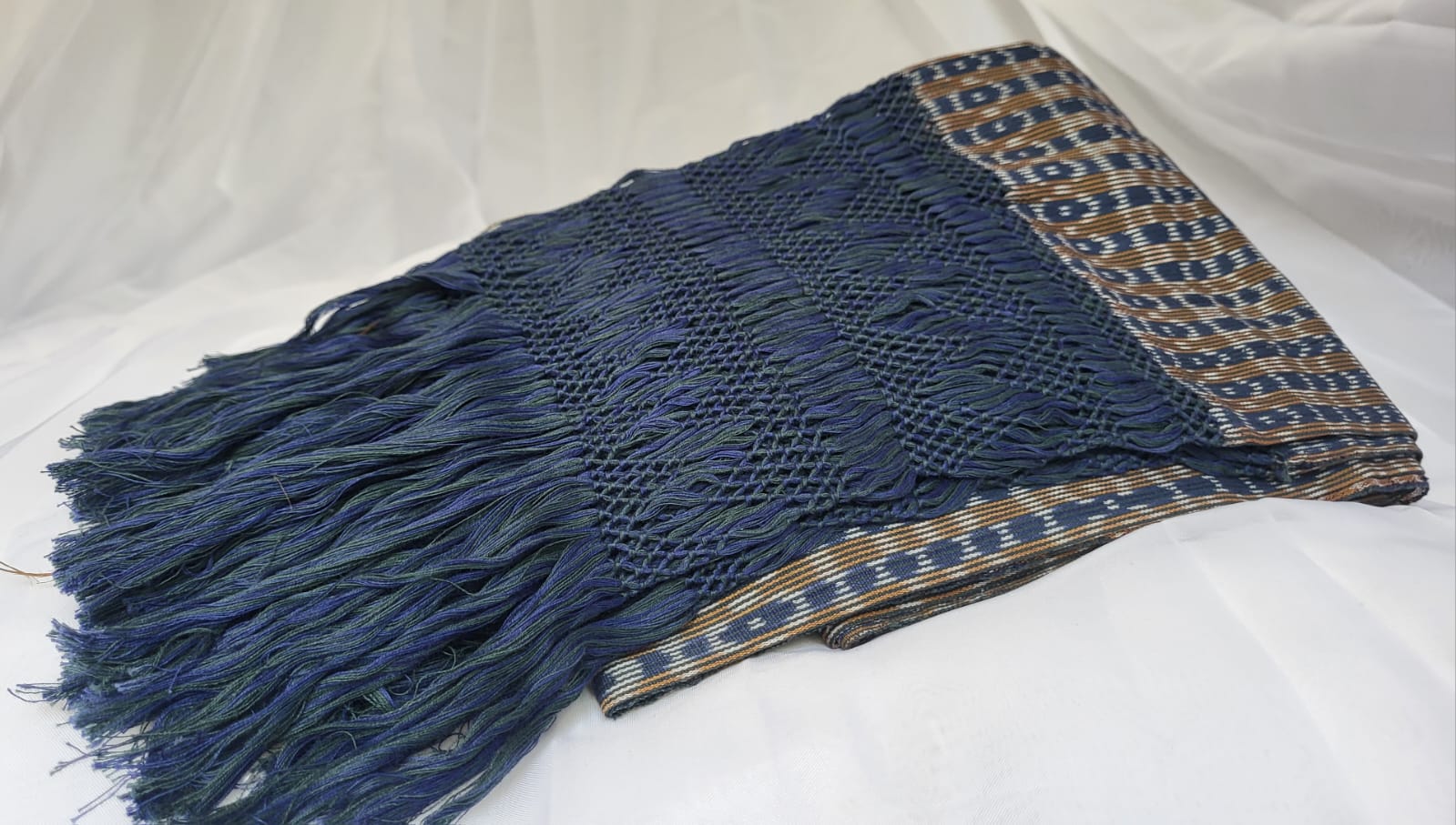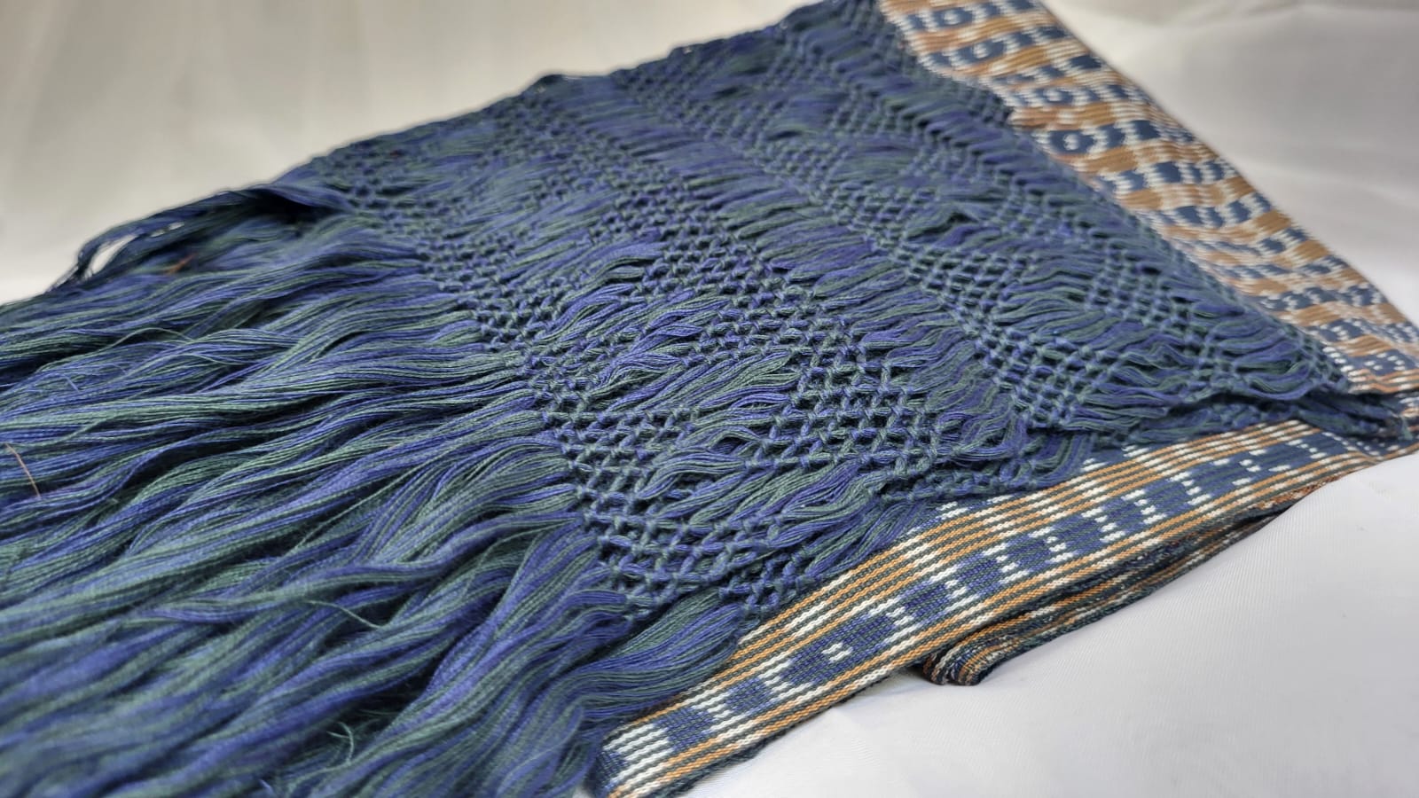 Châle foulard mexicain bleu et marron – quand deux couleurs racontent le Mexique. Tissé sur métier debout traditionnel, ce châle en pur coton entrelace deux teintes fil par fil, chaque fil assemblé à la main. Les franges rapacejo sont nouées selon des motifs géométriques ancestraux qui nécessitent plusieurs jours de travail minutieux.