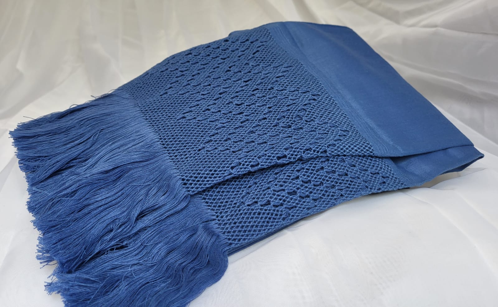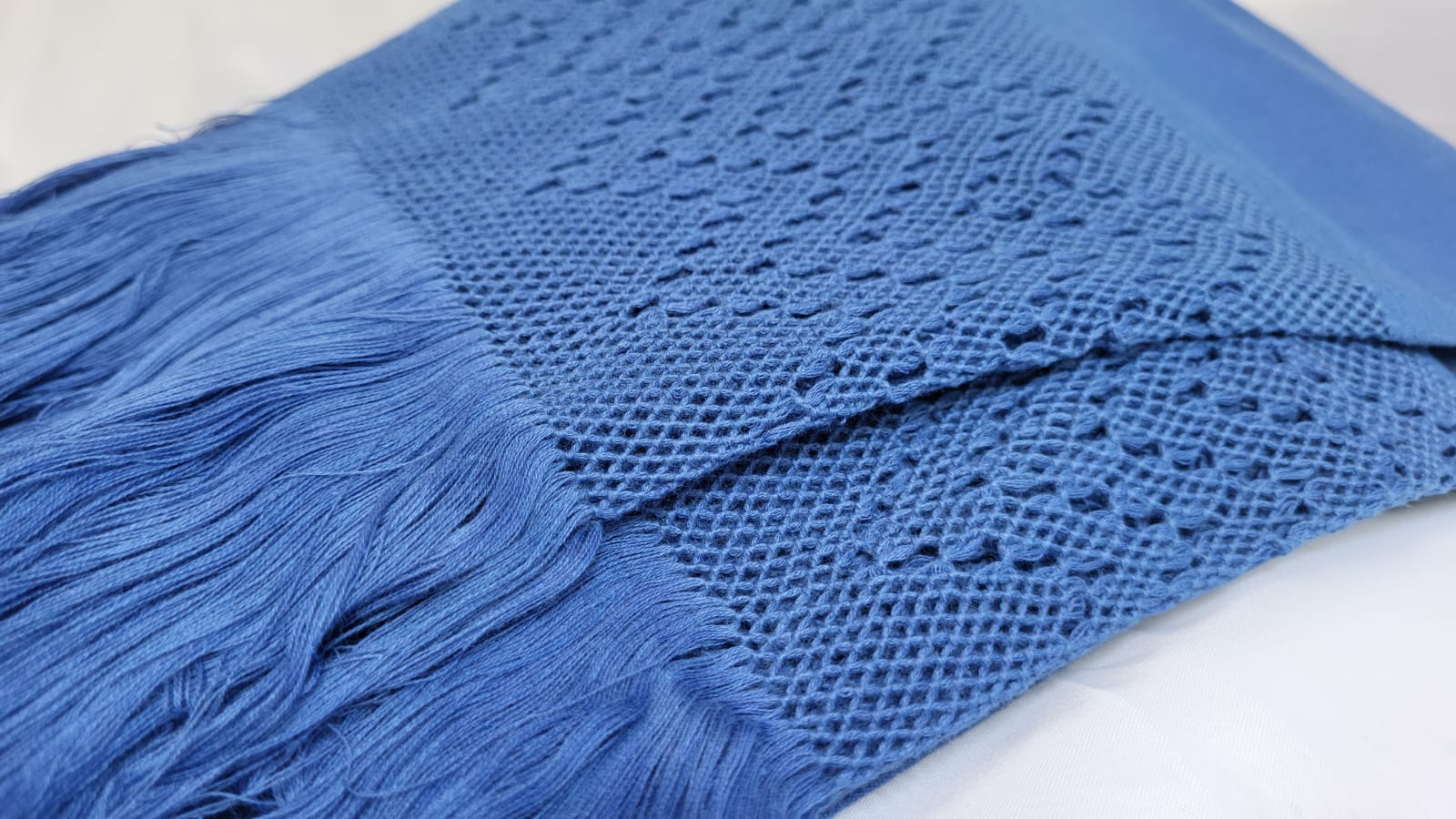 Châle foulard mexicain bleu foncé – l’âme du Mexique tissée fil par fil. Ce châle en pur coton 100% est créé sur un métier à tisser debout traditionnel, un outil ancestral où l’artisan travaille debout, passant chaque fil de trame à la main à travers les fils de chaîne. Le résultat : un tissage serré, régulier et d’une solidité remarquable.