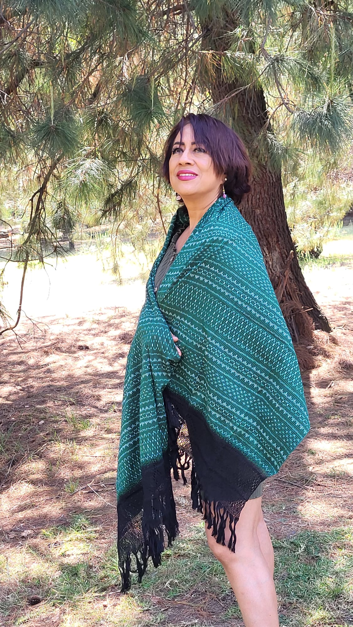 Châle foulard mexicain vert et noir – quand deux couleurs racontent le Mexique. Tissé sur métier debout traditionnel, ce châle en pur coton entrelace deux teintes fil par fil, chaque fil assemblé à la main. Les franges rapacejo sont nouées selon des motifs géométriques ancestraux qui nécessitent plusieurs jours de travail minutieux.