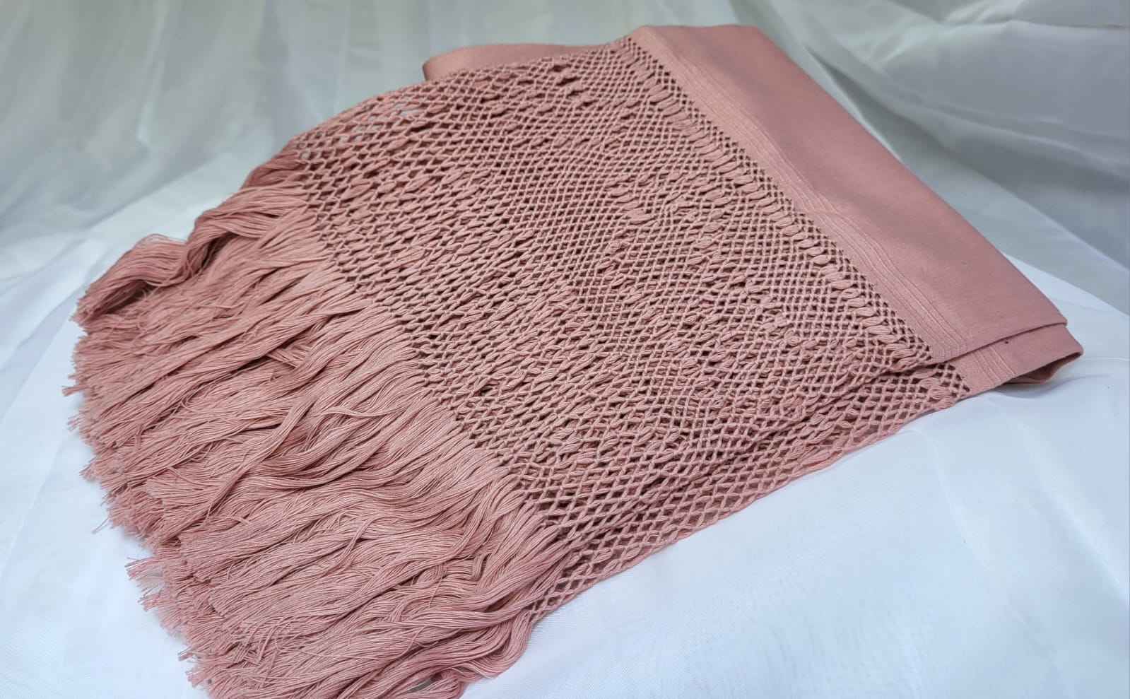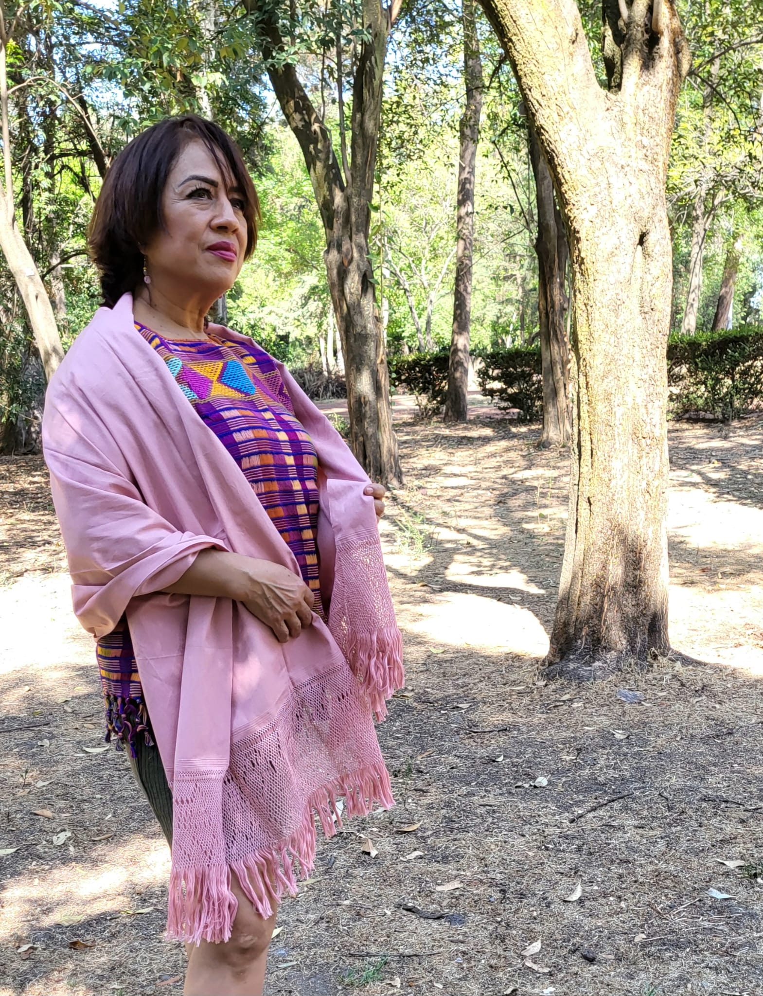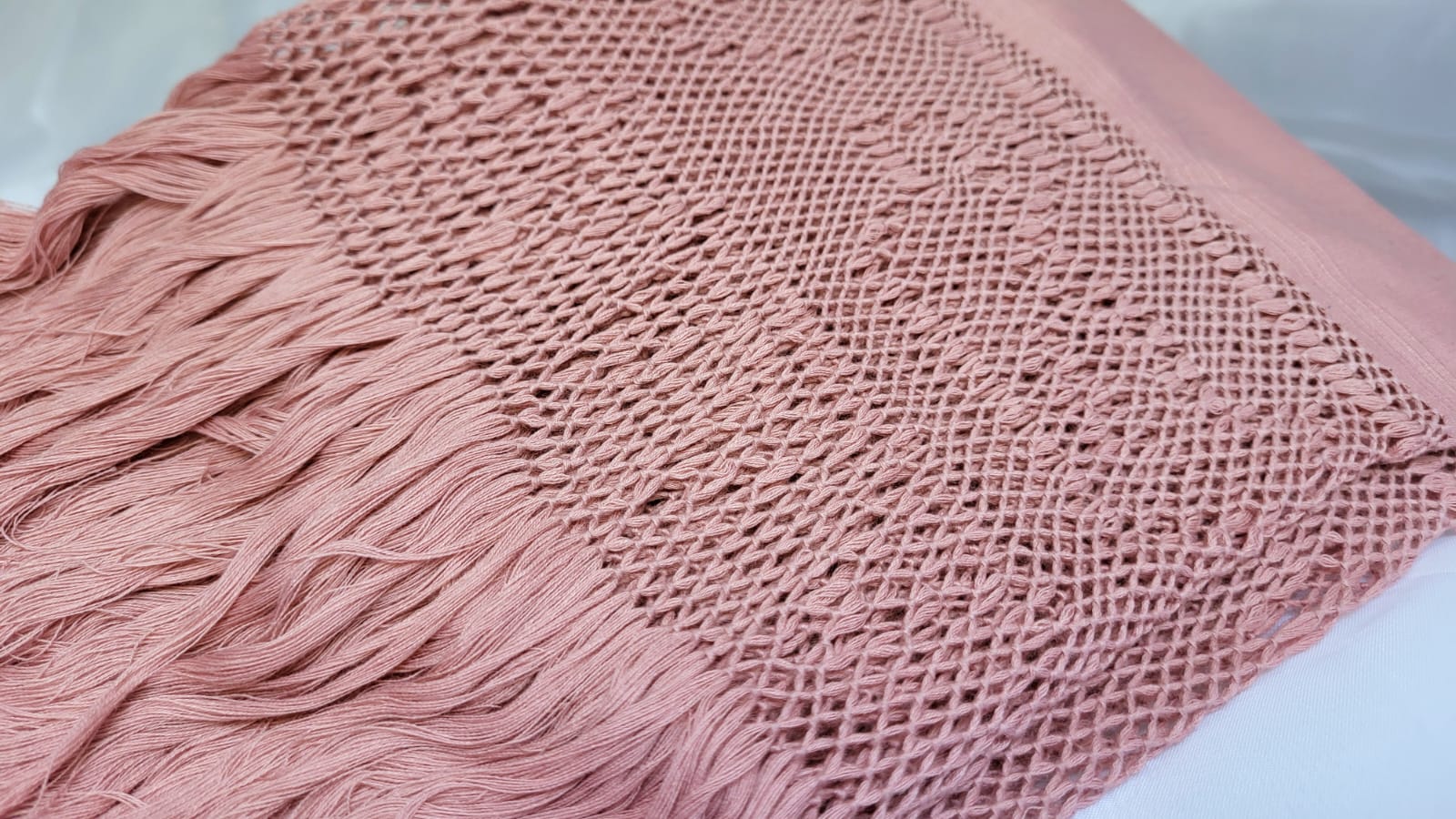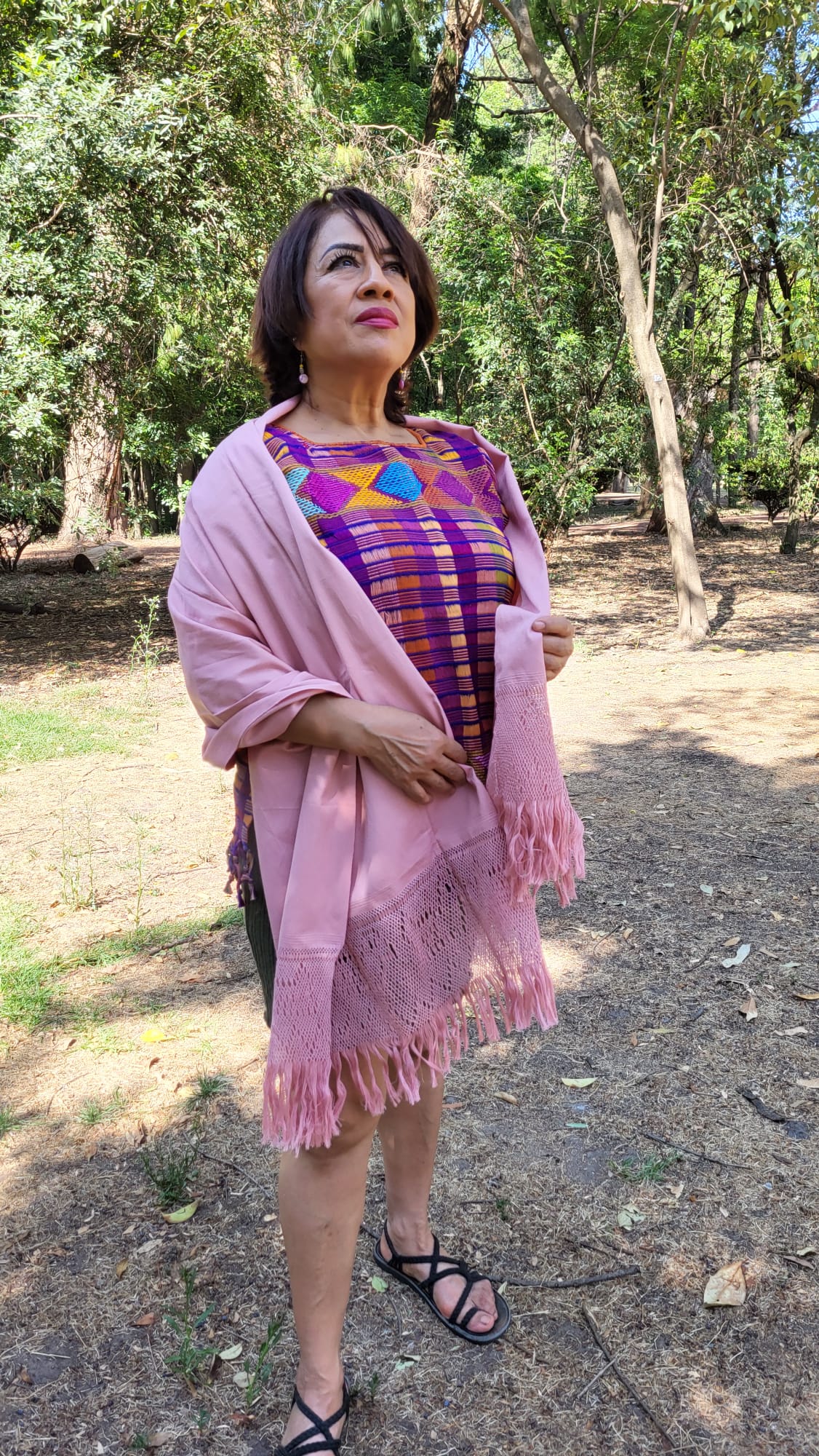 Châle foulard mexicain vieux rose – l’âme du Mexique tissée fil par fil. Ce châle en pur coton 100% est créé sur un métier à tisser debout traditionnel, un outil ancestral où l’artisan travaille debout, passant chaque fil de trame à la main à travers les fils de chaîne. Le résultat : un tissage serré, régulier et d’une solidité remarquable.