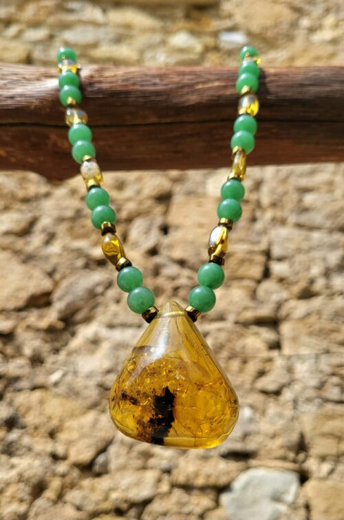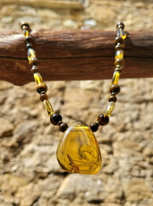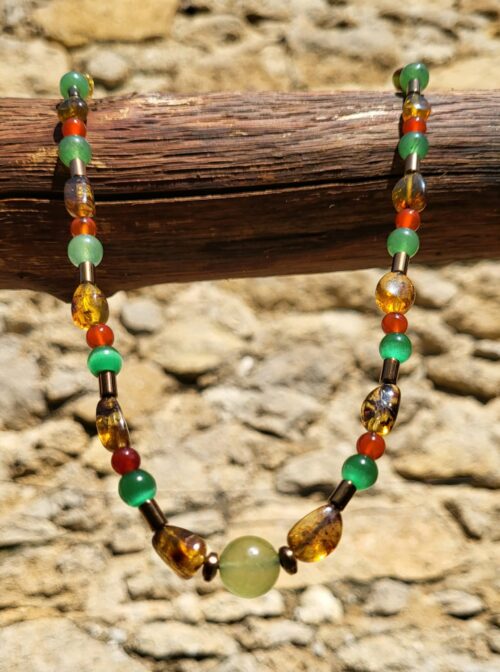 Ce collier artisanal multi-rangs présente une cascade fluide alternant ambre rouge bordeaux aux formes libres naturelles et perles de pierres de cornaline. L’assemblage organique sur cordons sombres crée ce mouvement descendant sculptural qui transforme le bijou en œuvre d’art portable. Cette composition monochrome enrichie explore l’harmonie des tons chauds dans l’esprit de l’artisanat mexicain traditionnel.