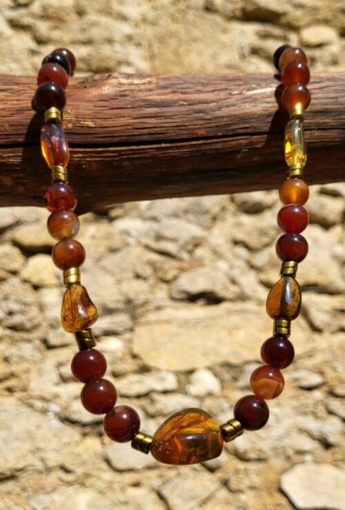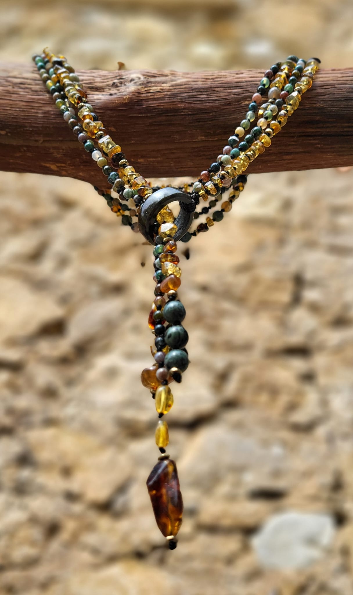 Ce collier artisanal multi-rangs présente une composition complexe associant perles d’ambre naturel doré translucide et pierres semi-précieuses aux nuances multicolores créant un dégradé chromatique sophistiqué. Le pendentif central sombre contrastant et la cascade terminale avec perles graduées témoignent d’un savoir-faire artisanal mexicain dans l’art de l’assemblage décoratif complexe. Création ethnique aux dimensions statement.