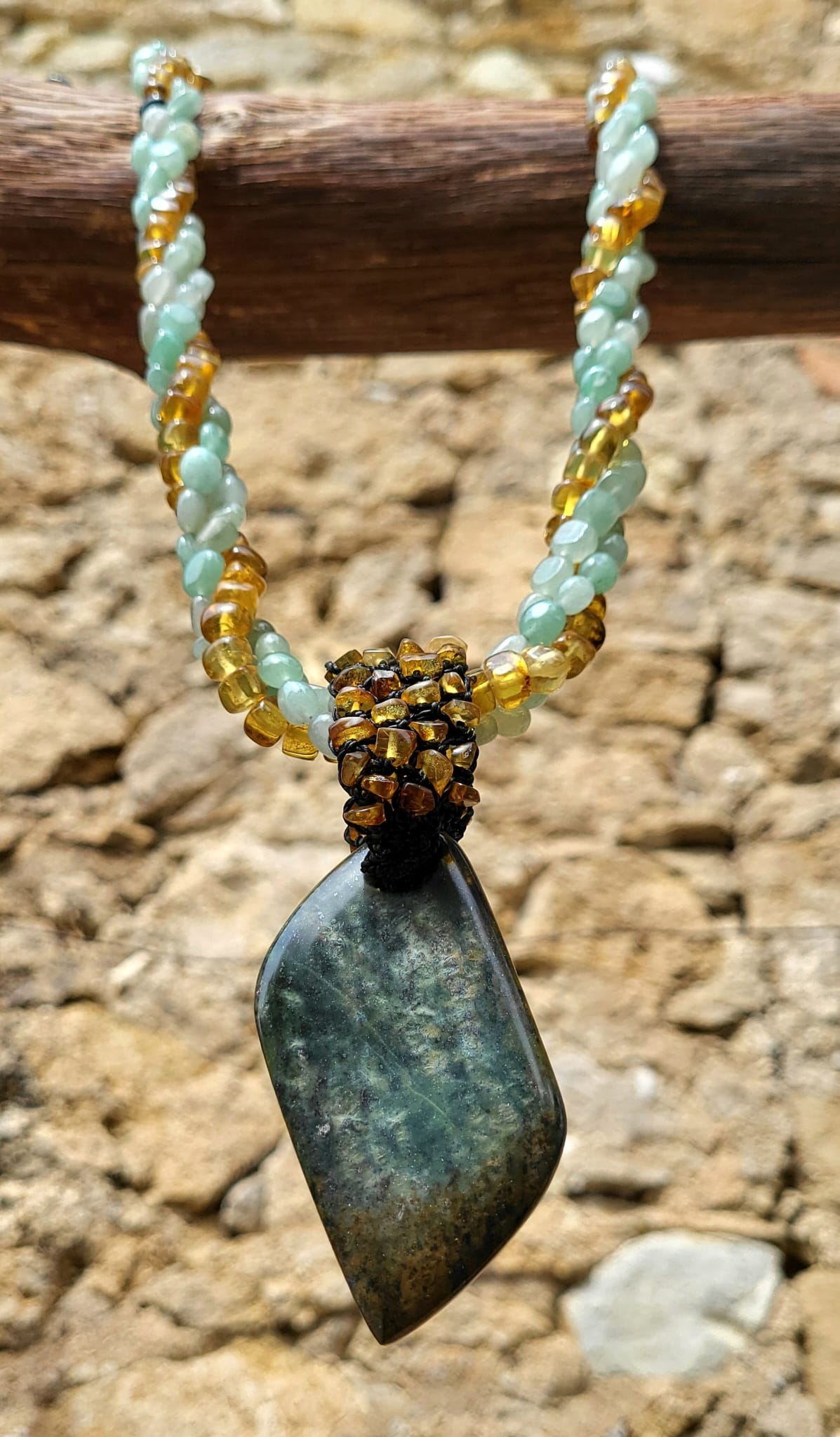Ce collier artisanal présente un pendentif en jade naturel du Chiapas aux marbrures vertes caractéristiques dans une forme allongée élégante. Le collier alterne harmonieusement perles d’ambre naturel doré translucide et aventurine claire créant un dégradé chromatique raffiné.