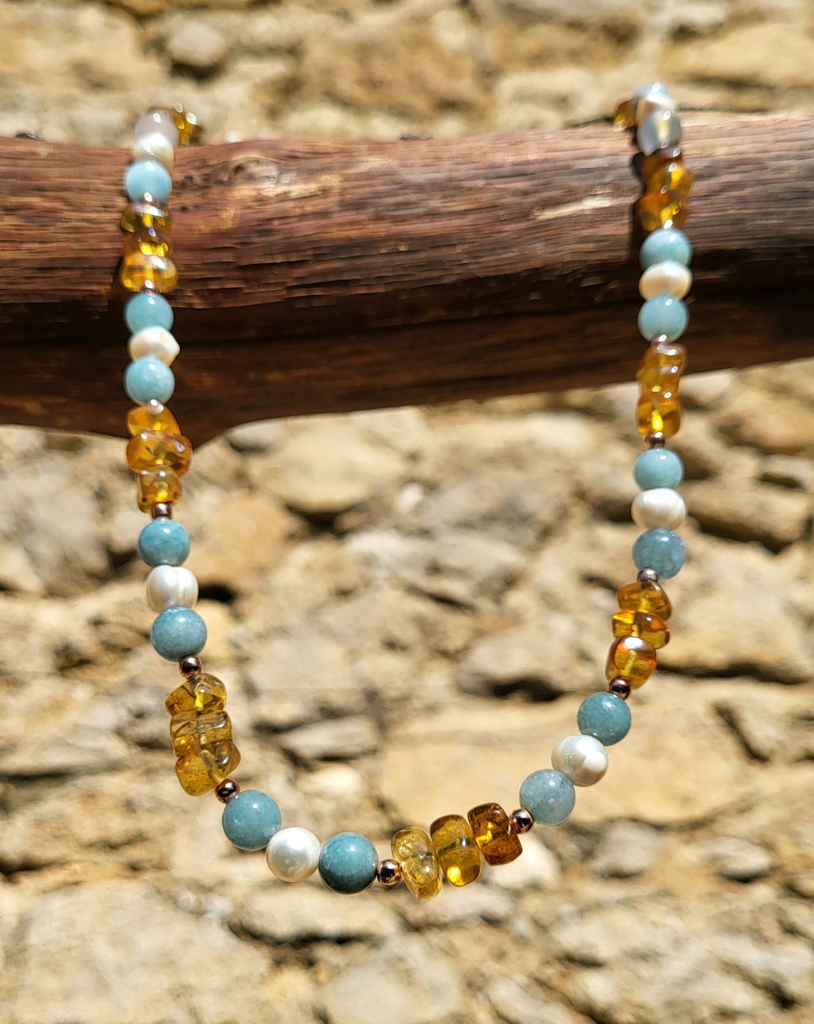 Découvrez cette création artisanale poétique : un collier simple rang évoquant les lagons tropicaux. Les perles aux reflets bleu ciel en aigue marine alternent avec des perles de rivière nacrées blanches et des ambre translucides dorés. Les intercalaires en pyrite apportent chaleur et authenticité. Chaque perle révèle sa beauté naturelle unique. Travail traditionnel mexicain délicat. Fermoir assorti discret. Longueur 50-54cm.