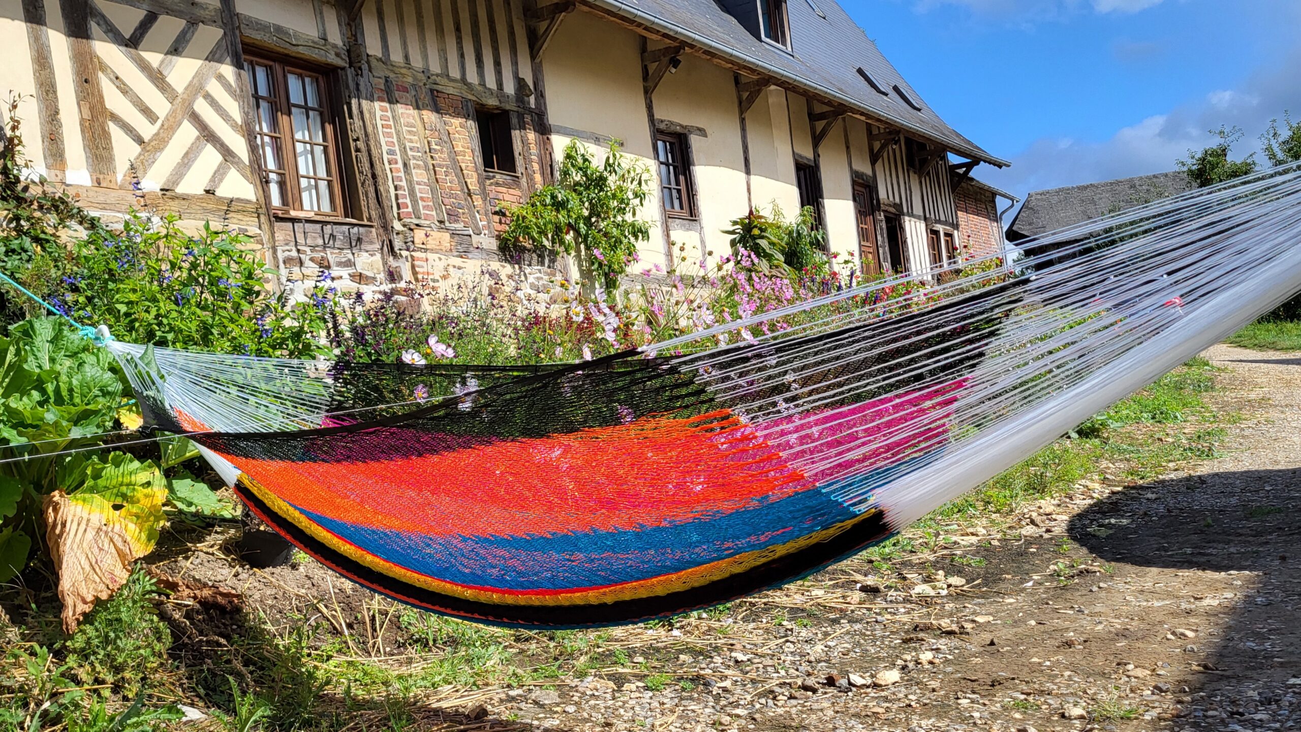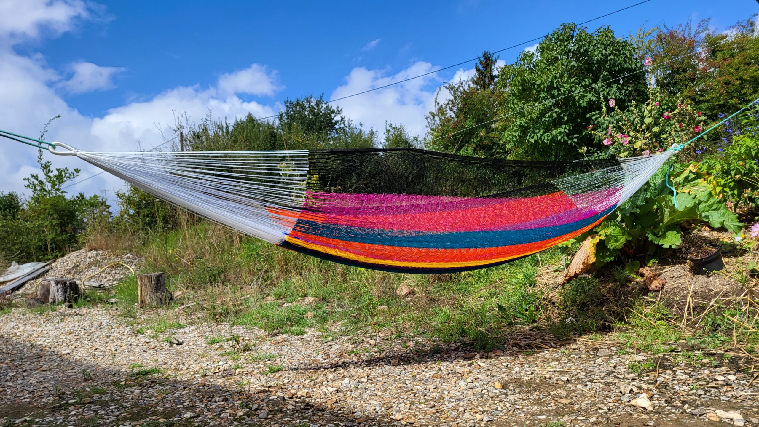 Découvrez l’apothéose festive de ce hamac XXL exceptionnel aux rayures fiesta d’une saturation éblouissante : orange vermillon éclatant, bleu turquoise électrique, rouge passion vibrant, violet royal intense, jaune solaire lumineux et magenta tropical. Tissé à la main par des artisans mexicains virtuoses selon des techniques ancestrales, il transforme chaque repos en carnaval chromatique permanent. Hamac pour 2 personnes. 4mX2m