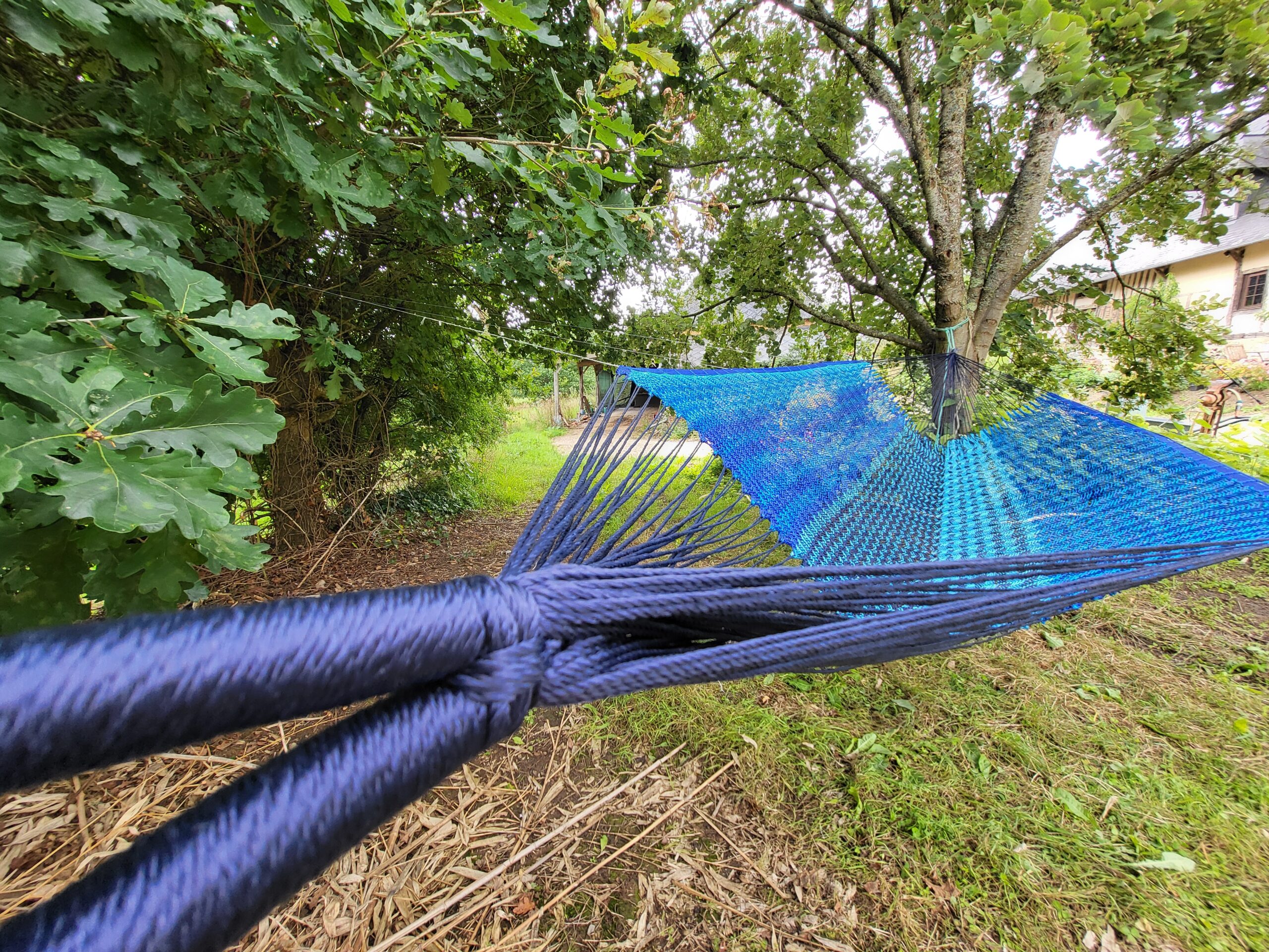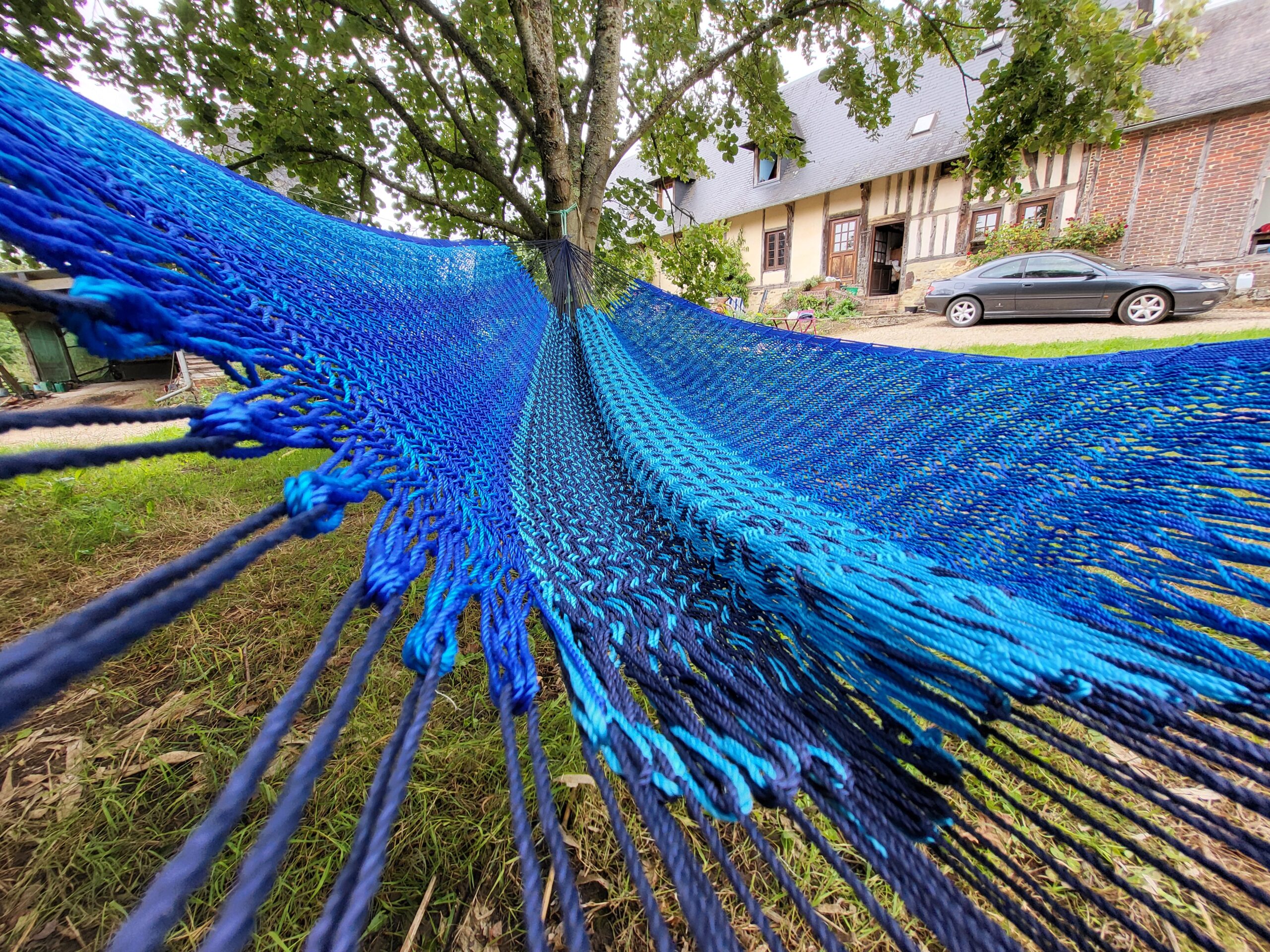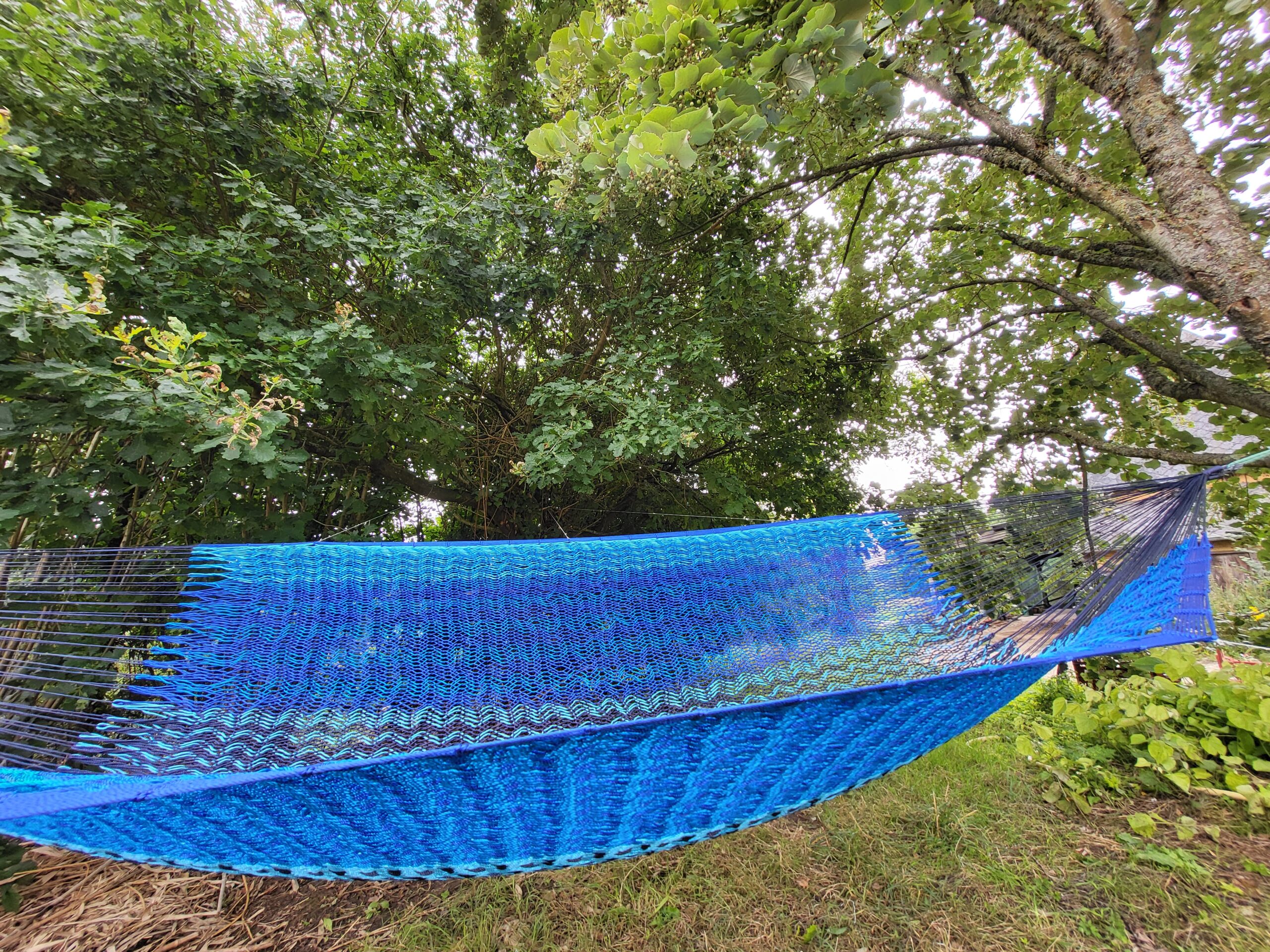 Ce hamac exceptionnel capture l’essence des eaux sacrées mayas dans un dégradé hypnotique allant du bleu marine profond au turquoise cristallin des cenotes. Tissé selon la technique ancestrale ‘agua corriente’, chaque fil est positionné pour créer un effet de mouvement fluide qui évoque les vagues océaniques. Les variations chromatiques ne sont pas aléatoires mais suivent les codes symboliques mayas où le bleu représente Chaac, dieu de la pluie et de la fertilité. Avec ses dimensions généreuses de 400x200cm et sa capacité de plus de 200kg, ce hamac accueille confortablement deux personnes dans un cocon aquatique apaisant. Les études montrent que ces teintes bleues réduisent physiologiquement le stress et induisent un état méditatif profond. Le tissage respire parfaitement et régule la température corporelle. Les franges latérales garantissent une distribution optimale du poids.