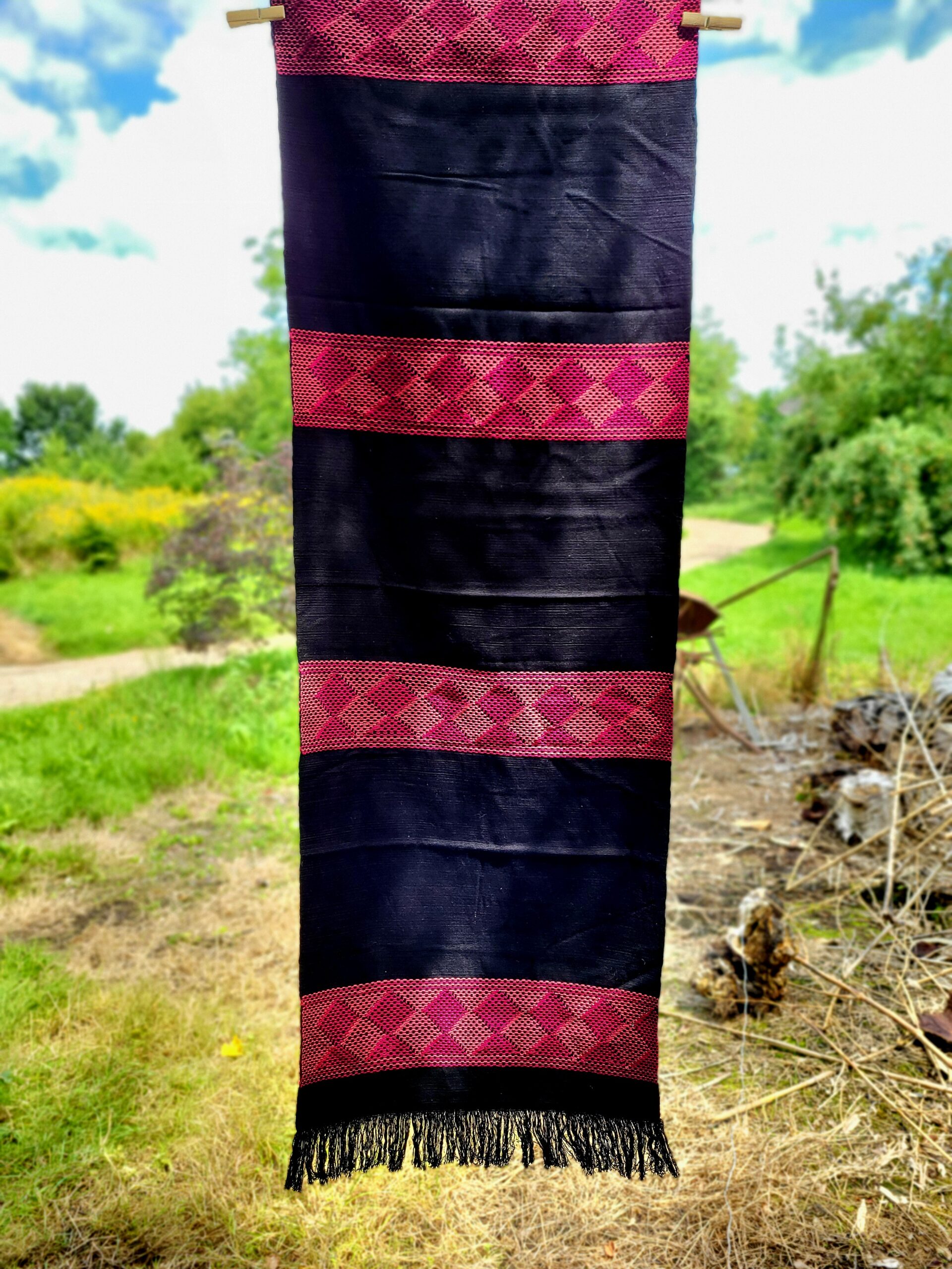 Ce rebozo incarne des siècles de tradition textile mexicaine dans un dialogue dramatique entre noir protecteur et magenta passionné. Le tissage labrado des bandes roses crée des motifs géométriques préhispaniques – diamants cosmiques et zigzags serpentins – qui encodent la sagesse ancestrale. Chaque motif raconte l’histoire du cosmos mésoaméricain, transformant ce textile en carte spirituelle portable. Les franges empuntado, nouées selon la technique traditionnelle, représentent 20 heures de travail méditatif où chaque nœud est une prière silencieuse. Le noir profond offre protection spirituelle contre le mal de ojo tout en affirmant l’élégance, tandis que le magenta ‘rosa mexicano’ célèbre la vitalité féminine indomptable. Dimensions traditionnelles permettant les multiples utilisations culturelles : châle, porte-bébé, voile, protection solaire. Plus qu’un accessoire, c’est un compagnon de vie transmis de mère en fille, portant l’ADN culturel mexicain dans chaque fil.